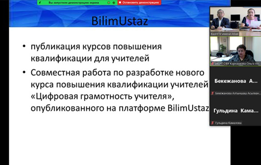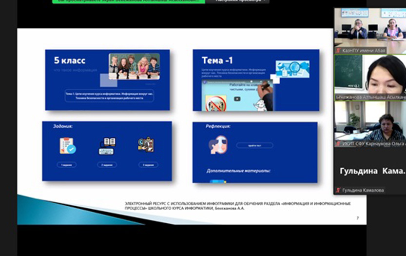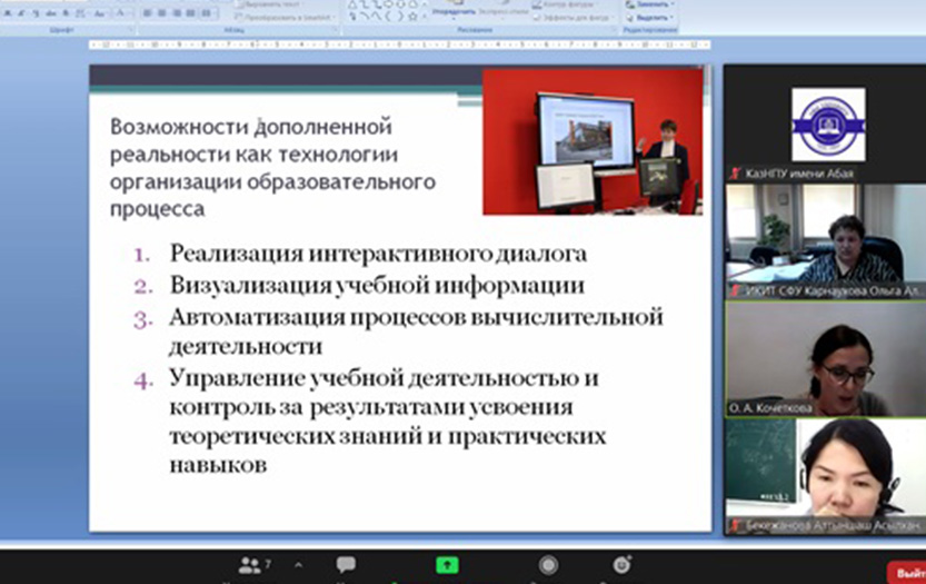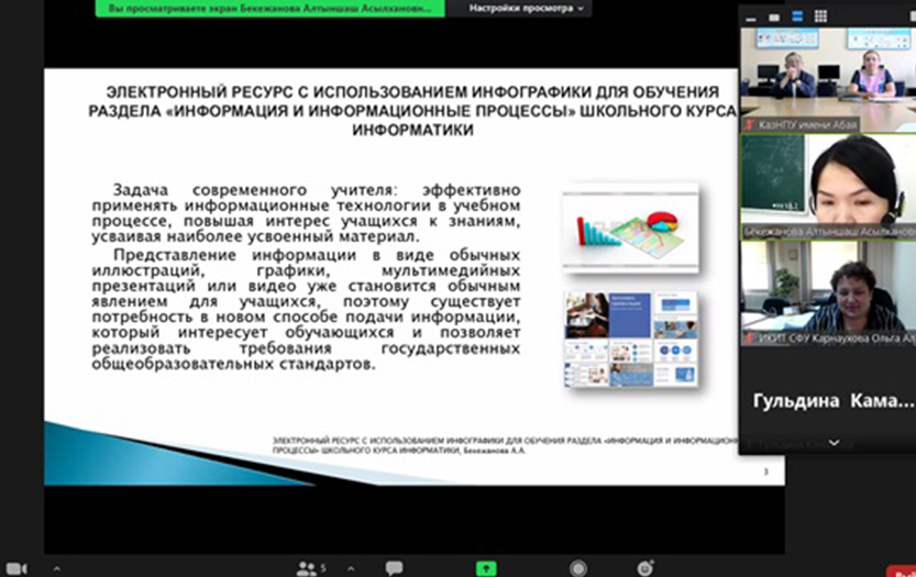 2021 жыл 21-24 қыркүйекте Абай атындағы ҚазҰПУ-да Сібір федералды университетінің (Красноярск) базасында «Білім беруді ақпараттандыру және электрондық оқыту әдістемесі: білім берудегі цифрлық технологиялар» атты V Халықаралық ғылыми конференция өтті. Іс-шараларға біздің университеттің Білімді ақпараттандыру мәселелері және білім технологиялары халықаралық ғылыми зертханасының қызметкерлері п.ғ. д., профессор, Білімді ақпараттандыру мәселелері және білім технологиялары халықаралық ғылыми зертханасының меңгерушісі Е.Ы.Бидайбеков, п.ғ.к., информатика және білімді ақпараттандыру кафедрасының меңгерушісі Н.Т.Ошанова, п. ғ. к., профессор м.а. С.Н.Конева, оқытушылар М.И.Ревшенова, Н.А.Құрманғалиева, А.А.Бекежанова және басқалар қатысты. С.Н.Конева мен А.А.Бекежанова секциялық баяндамалар жасады. Баяндамалардың тақырыптары мұғалімнің цифрлық сауаттылығын қалыптастыруға арналған BilimLand платформасына, мектептегі информатика курсының «Ақпарат және ақпараттық процестер» бөлімін оқыту үшін инфографиканы пайдаланатын электрондық ресурсқа арналды.