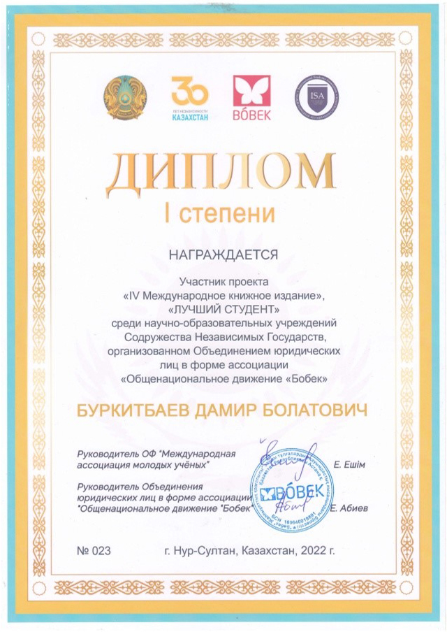 Абай атындағы ҚазҰПУ 3 курс студенті «6В01506-Физика-информатика» білім беру бағдарламасы бойынша білім алып жатқан Бүркітбаев Дамир «Бөбек» жалпыұлттық қозғалысы» қауымдастық нысанындағы заңды тұлғалар бірлестігінің қолдауымен Халықаралық студенттер қауымдастығы (Нұр-сұлтан қаласы) ұйымдастырған 2022 жылғы «ТМД-ның үздік студенті» халықаралық жобасының жеңімпазы атанды, онда ол І дәрежелі дипломмен, білім, ғылым, спорт және мәдениетке қосқан үлесі үшін төсбелгімен және «ТМД-ның үздік студенті - 2022» төсбелгісінің куәлігімен марапатталды.