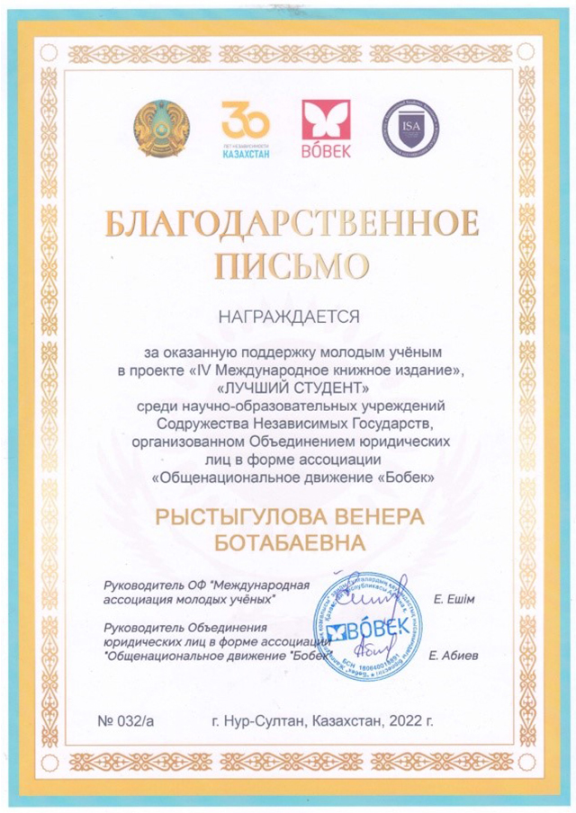 Әрине, ғылыми зерттеулерге деген студенттің таланты мен қабілетін анықтауға, сондай-ақ қажетті арнаға бағыттауға педагог пен ғылыми жетекші көмектеседі. Осы жобаның ғылыми жетекшісі ретінде шебер-педагог, «Физика» кафедрасының қауымдастырылған профессоры Венера Рыстыгулова да алғыс хатпен марапатталды.