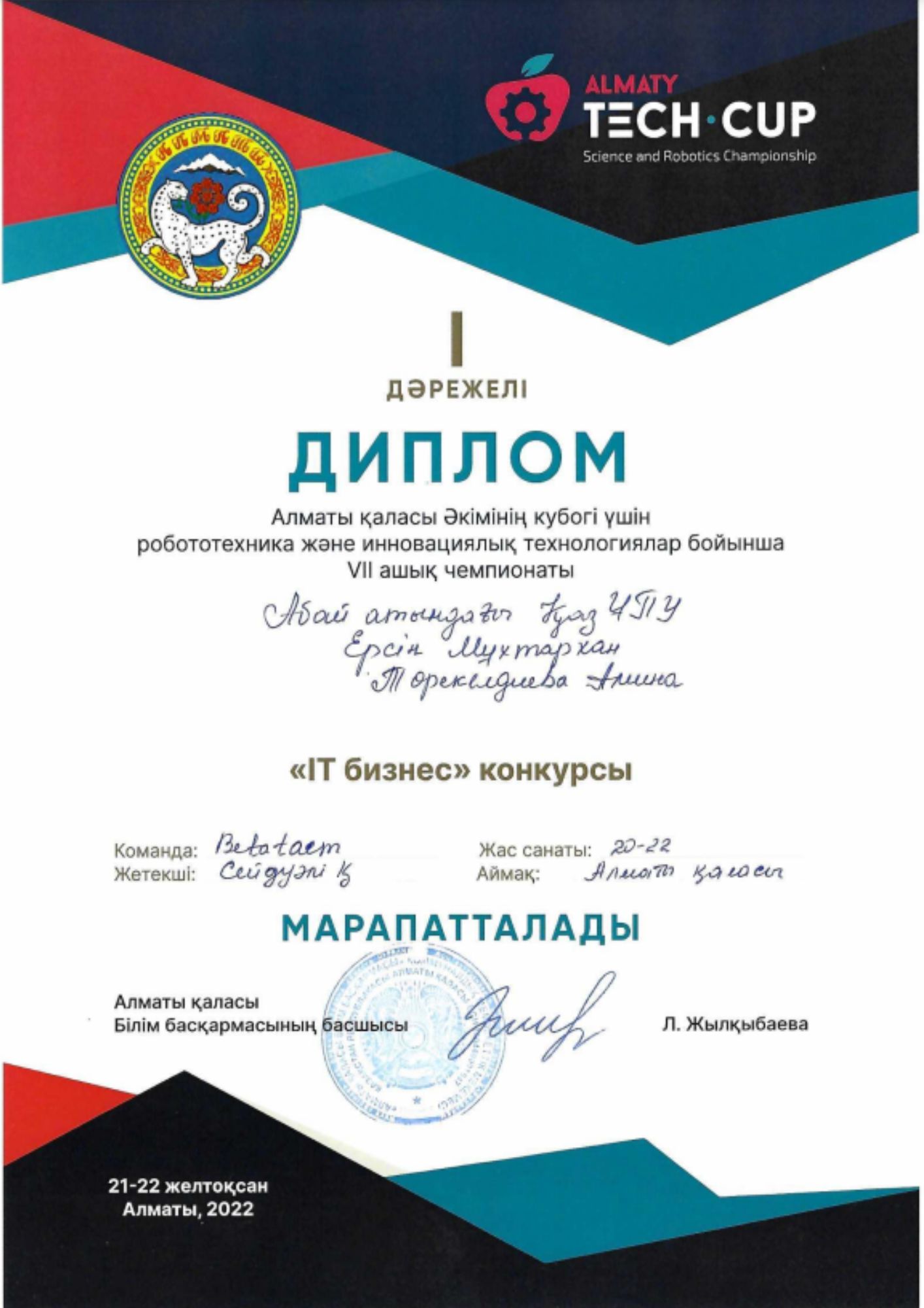Тағы бір командамыздың жобасы инвесторлардың Акселератор сертификатымен марапатталды. Команда құрамы: «Информатика және робототехника» мамандығының 4-ші курс студенті Алтынбай Біржан, «Информатика ағылшын тілінде» мамандығының 3-ші курс студенті Жібек Төрекелдиева.