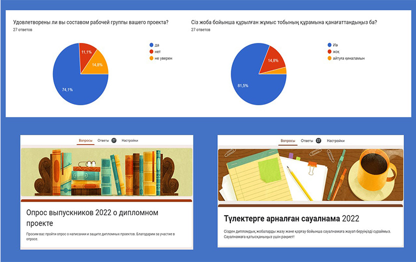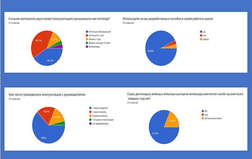 Педагогика және психология институты Бастауыш білім беру кафедрасы 2022 жылғы түлектермен дипломдық жобаларды жазу және ендіру нәтижелері туралы сауалнама жүргізді. Сауалнамаға 54 түлек (27 орыс бөлімі және 27 қазақ бөлімі) қатысты. Бастауыш білім беру кафедрасының түлектерінің 70% диплом жобасына жетекшілік етуді ұйымдастырудың сапасын жоғары деп бағалады.