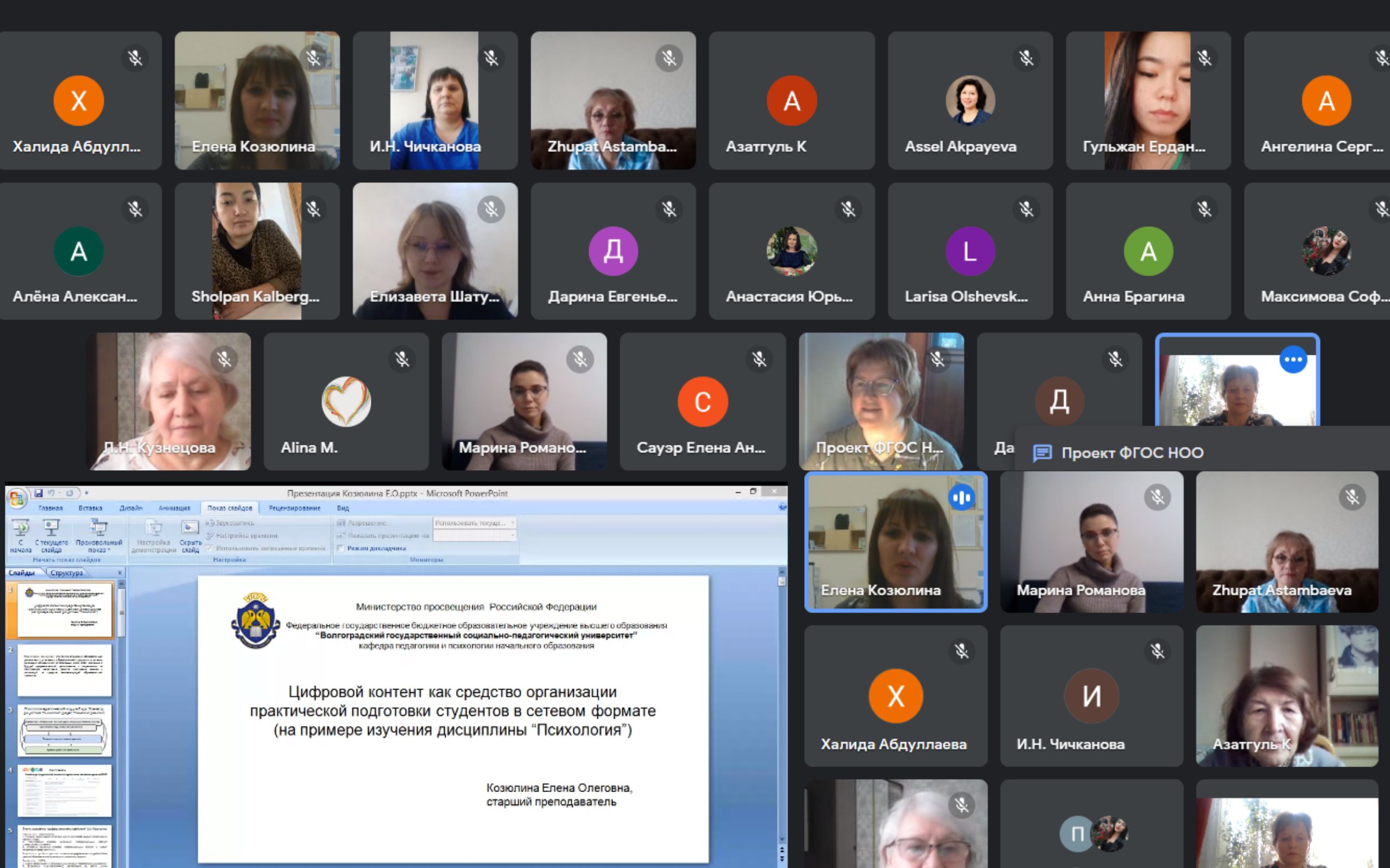 ВӘГПУ (Волгоград, Ресей) бастауыш білім беру педагогикасы және психологиясы кафедрасының аға оқытушысы Е.О.Козюлина «Цифрлық контент студенттерді желілік форматта практикалық даярлауды ұйымдастыру құралы ретінде» мәселесін көтерді. Педагог «Психология» пәні бойынша онлайн контент құру тәжірибесімен бөлісіп, студенттерге тапсырмалар жасау алгоритмін көрсетті. Е.О.Козулина қатысушыларға жасалған баяндама бойынша сұрақтарға жауап беріп, тапсырмаларды орындауды ұсынды.