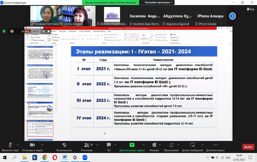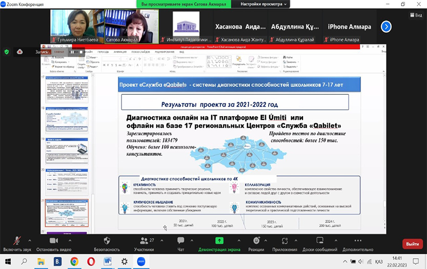 Кездесу барысында профессор 4«К»: критикалық талдау, креативтілік, коммуникация, коллаборация XXI ғасыр дағдыларын қарастырды. Сонымен қатар Абай атындағы ҚазҰПУ жалпы және қолданбалы психология кафедрасының ғылыми ұжымымымен әзірленген оқушылардың қабілеттерін дамыту және психологиялық диагностикалау бағдарламасы ұсынылды, ол өзіне El Úmiti IT платформасында 12-14 жастағы жасөспірімдердің кәсіби тұлғалық бейімділіктері мен қабілеттерін диагностикалаудың әдістері кешенін кіріктірді.