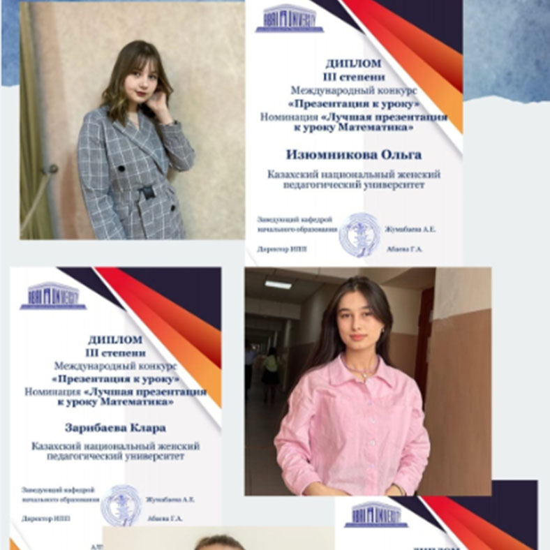«Математика» сабақтарына арналған үздік тұсаукесер» номинациясы бойынша: 1 орын - Акмалбаева Диёра (Қазақ қыздар ұлттық педагогикалық университеті); Супрунова Ксения (В.Шукшина атындағы Алтай мемлекеттік гуманитарлық-педагогикалық университеті). 2 орын - Жанжігіт Жадыра, Каскен Мерей, Мирасланова Дана (Қазақ қыздар ұлттық педагогикалық университеті); 3 орын - Халматова Хапиза, Изюмникова Ольга, Зарибаева Клара (Қазақ қыздар ұлттық педагогикалық университеті).
