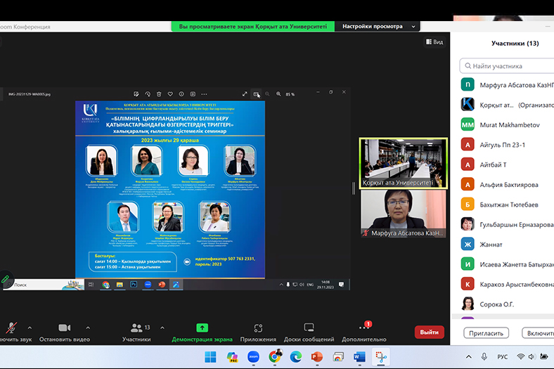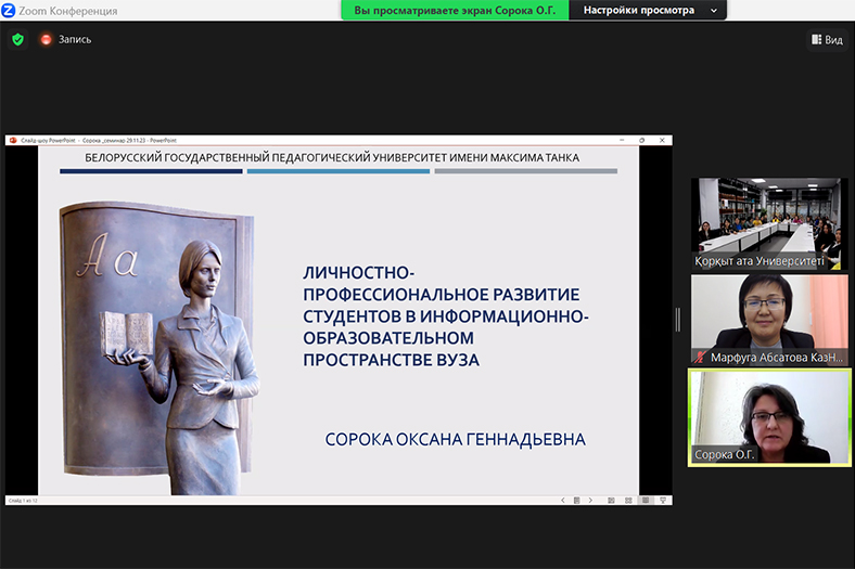 Семинарды Басқарма мүшесі-академиялық мәселелер жөніндегі проректор Абдрашева Дана алғы сөзбен ашып, бағдарламаға сәйкес шетелдік қонақтар: доцент Сорока Оксана (Беларусь), доцент Хазратова Фируза (Татарстан, Ресей), сонымен қатар қазақстандық ғалымдар профессор Майгельдиева Шарбан, доцент Игенбаева Рабига (Қызылорда университеті), доктор PhD Махамбетов Мұрат (А. Жұбанов атындағы Ақтөбе өңірлік университеті) сөз сөйледі.