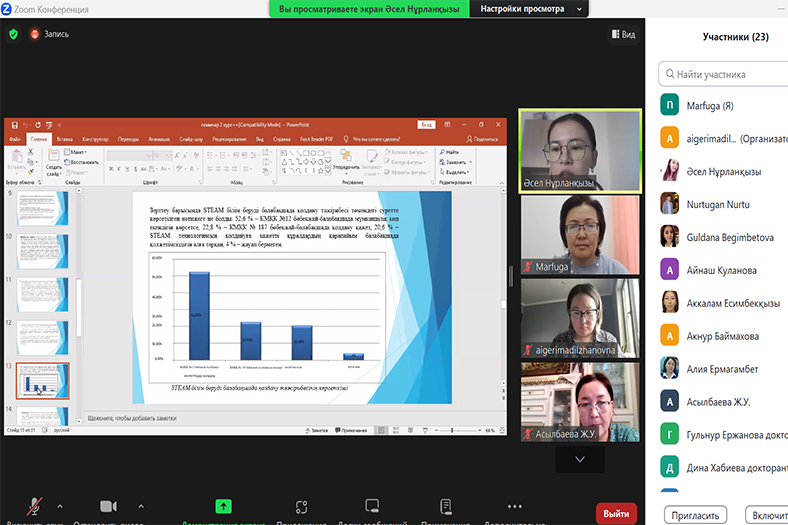 Семинарда 2-3 курс докторанттары Утепбаева А., Манжибаева Ж. (8D01901), 2 курс докторанттары Аманжолова Ә. (8D01201), Асылбаева Ж. (8D01301), Утемисова Ж. (8D01101) зерттеу жұмысының теориялық және практикалық нәтижелерімен бөлісті. Ғылыми семинарда білім берудің цифрлық трансформациясы жағдайында болашақ бастауыш сынып педагогтерінің кәсіби дағдылары, сөйлеу бұзылыстарын анықтауда жасанды инттелект алгоритмі, мектепте аутизм спектрі бұзылған бастауыш сынып оқушыларын әлеуметтендіру, студенттердің әлеуметтік жауапкершілігін еріктілік іс-әрекет процесі, сондай-ақ мектеп жасына дейінгі балалардың танымдық дағдысын дамытудағы STEAM технологиясының мүмкіндіктерінің мәселелері зерделенді. Докторанттар өзара дискуссияға түсті.