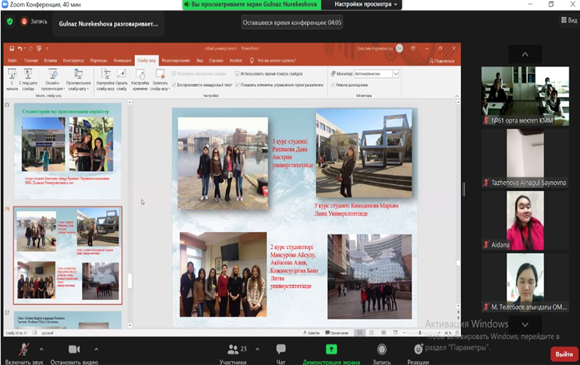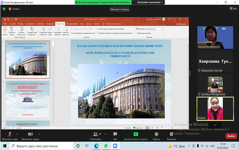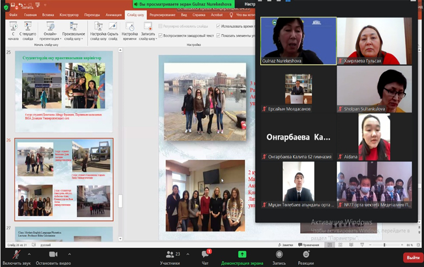 2022 жылдың 25 ақпанында Филология және көптілді білім беру инcтитуты шетел тілдері кафедрасының аға оқытушылары: Г.Р.Нурекешова, Ш.У.Султанкулова, А.С.Таженова, Г.Х.Хаирлаева, Г.К.Мырзаханова Республика мектептерінің мұғалімдері мен мектеп бітіруші түлектеріне арнап «Бәсекеге қабілетті тұлға қалыптастыру - уақыт талабы» тақырыбында кәсіби бағдар беру жұмыстарын жүргізді. Іс-шараға Алматы каласы, Алматы облысы Алакөл ауданы Жайпақ ауылы, Қызылорда облысы Арал ауданы, Туркестан облысы, Жетісай аудандарының мектептері қатысты.