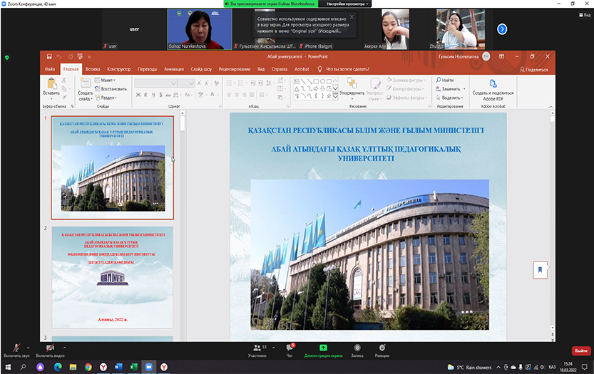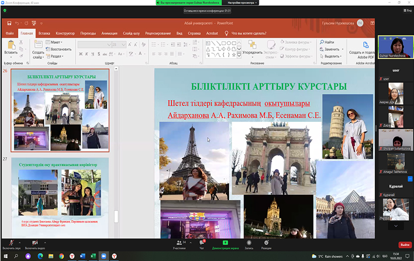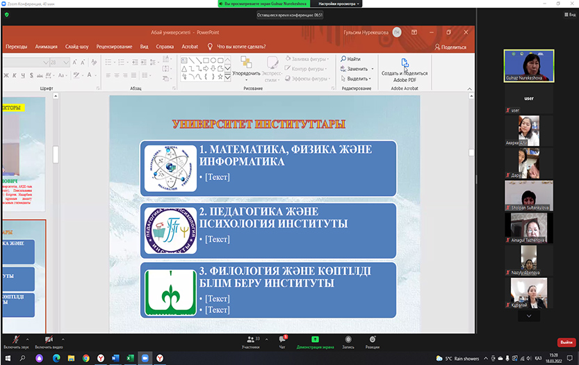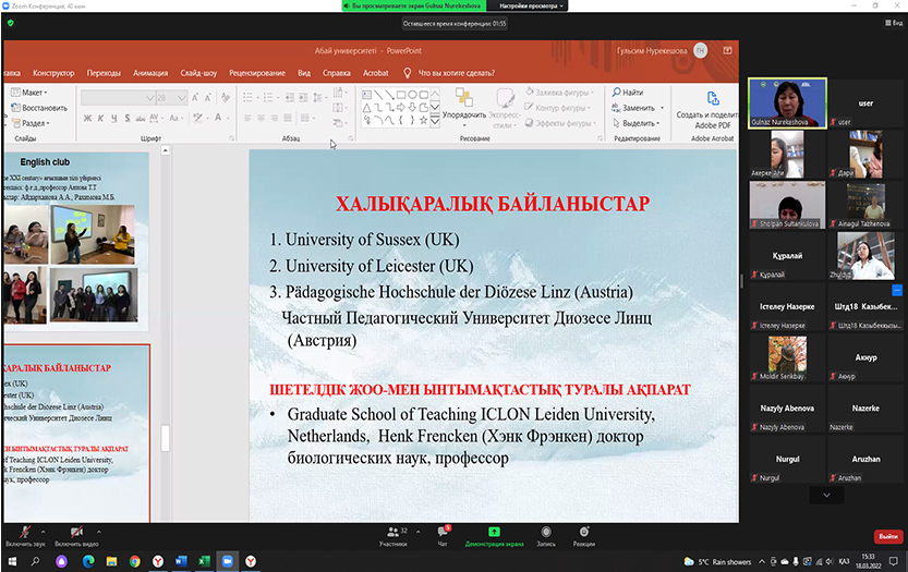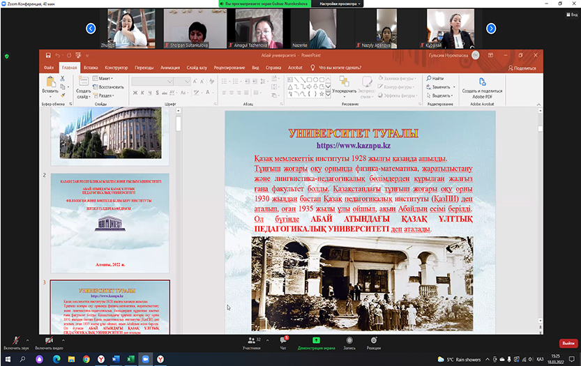 Нурекешова Г.Р. виртуалды 3D тур арқылы университетіміздің сайтынан жалпы шолу жасап, Абай атындағы Қазақ ұлттық педагогикалық университетінің алғаш құрылғанынан бастап қазірге дейінгі қол жеткізген жетістіктеріне тоқталды, сонымен қатар университеттегі жеңілдіктермен, студент-жастарға арналған білім жолындағы мүмкіндіктерімен бөлісті.