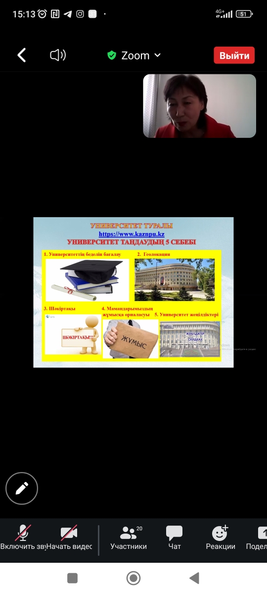 Кездесу барысында 95 жылдық тарихы бар еліміздегі алғашқы университеті болып табылатын Абай атындағы Қазақ ұлттық педагогикалық университетінің бүгінгі таңдағы білікті мамандар даярлауда еңсесі биік жоғары білім ордасы жайында видеороликтер көрсетіліп, «Шетел тілі: екі шетел тілі» мамандығының заманға сай өміршең мамандықтар қатарында екендігін кафедра оқытушылары тартымды баяндап берді.