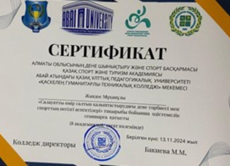 «Салауатты өмір салтын қалыптастырудағы дене тәрбиесі мен спорттың негізгі аспектілері» 2024 жылдың 13 қарашасында Қаскелең Гуманитарлы-техникалық колледжінде «Салауатты өмір салтын қалыптастырудағы дене тәрбиесі мен спорттың негізгі аспектілері» тақырыбында республикалық семинар өткізілді.
