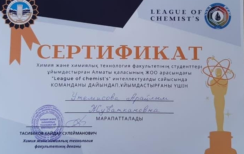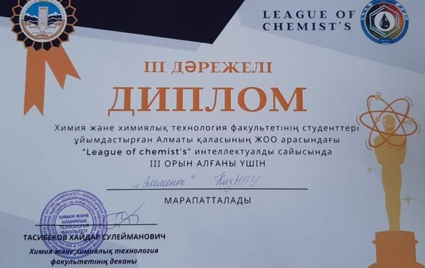 2021 жылдың 4 желтоқсанында әл-Фараби атындағы ҚазҰУ, химия және химиялық технологиялар факультетінің студенттері ұйымдастырған, Алматы қаласының ЖОО-дары арасында, «League of Chemist`s» тақырыбындағы интеллектуалдық сайыс өткізді www.kaznu.kz. Интеллектуалдық сайыс бес турдан тұрды.