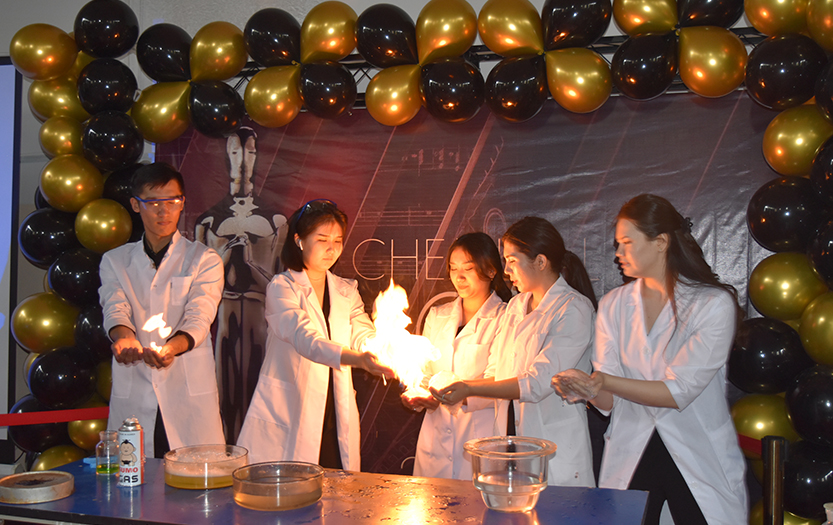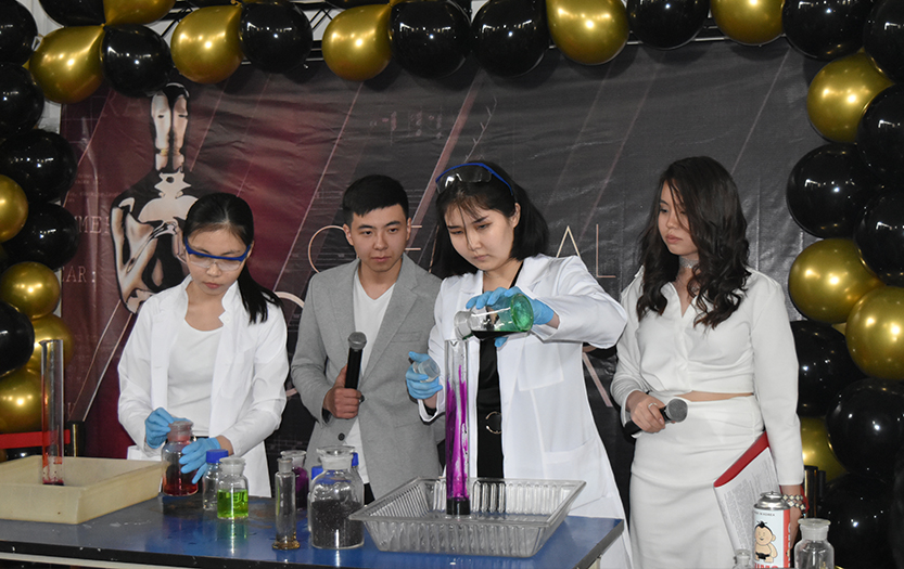 «CHEMICAL OSCAR» кешінде 3 курс студенттері Талипов Ержігіт, Пернебекова Ақшолпан, Калмуратова Балжан «Жанбайтын орамал», «Пробиркадағы найзағай», «Көбік жарылысы» және «Отты көбік» түрлі химиялық эксперименттер көрсетті.