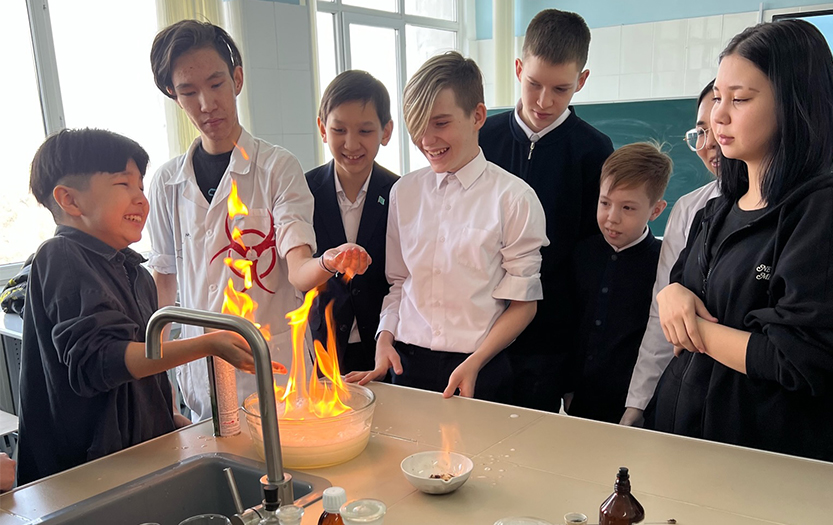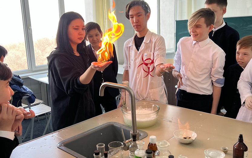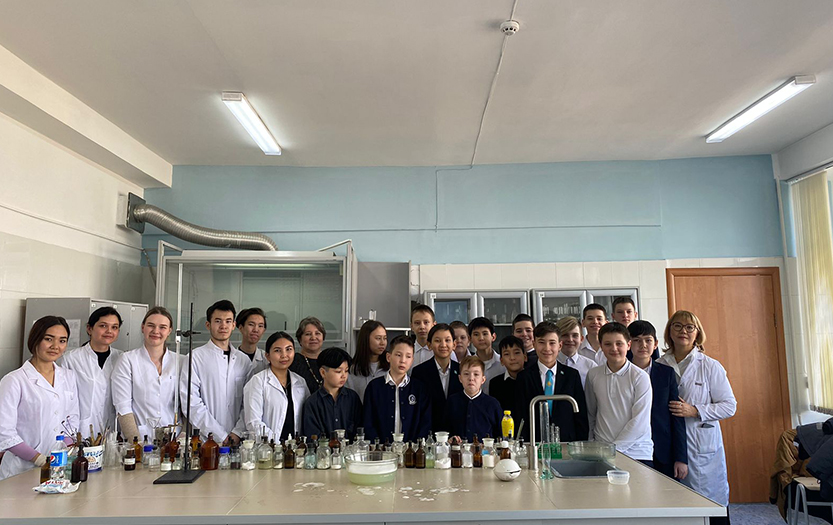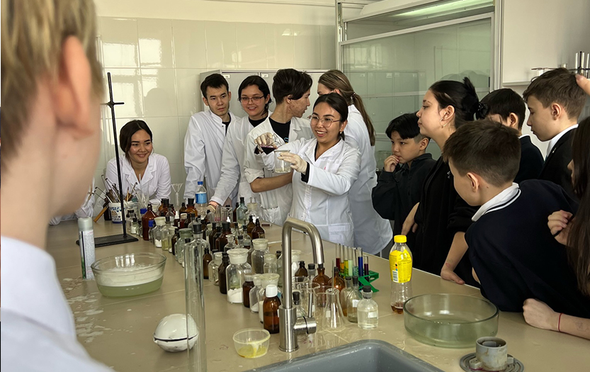 Мектеп оқушыларының химия пәніне деген қызығушылығы мен ынтасын арттыру мақсатында 2-3 курс студенттері қоршаған ортада болып жатқан процестерді көрсететін түрлі жарқын химиялық тәжірибелер дайындады. Химиялық кеш интерактивті және қызықты өтті, оқушылар химиялық эксперименттерге қызығушылық танытты және оларды жүзеге асыруға тікелей қатысты.