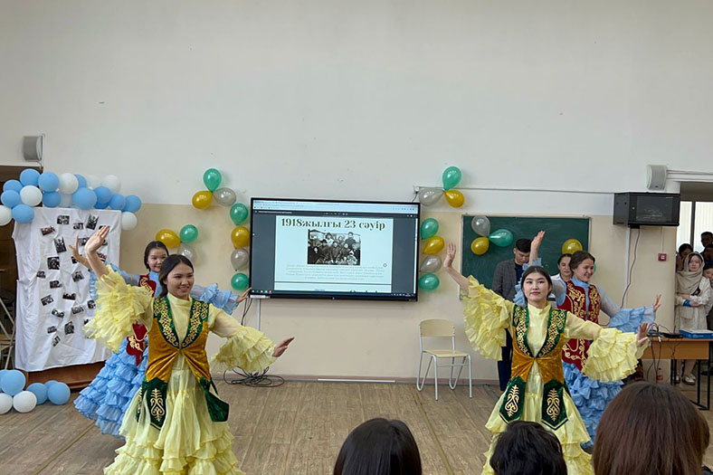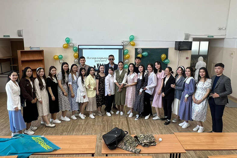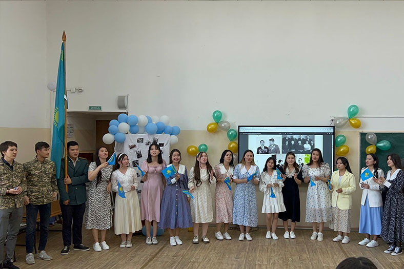 Мерекелік шараға тәрбие ісі жөніндегі директордың орынбасары Серік Бакиров пен химия кафедрасының оқытушысы Жанар Жаксибаева батыр жазушы Қасым Қайсеновпен мектеп қабырғасында кездескендігі туралы естеліктерімен бөлісіп, студенттердің дайындығына алғыстарын айтып, жүрекжарды тілектерін білдірді.