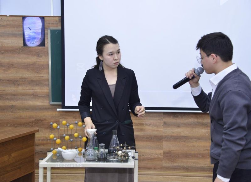 Химик-ұшқыштар «Найзағай», «Химиялық кемпірқосақ», «Құрғақ мұз» және «Сұйық азот» тақырыптарында қызықты химиялық тәжірибелер көрсетті. Интерактивті тақтада химиялық демонстрациялар көрсетілді. Көрермендерге арналған «Химиялық лото» ойыны ойнатылды және жеңімпаздарға құнды сыйлықтар табыс етілді.