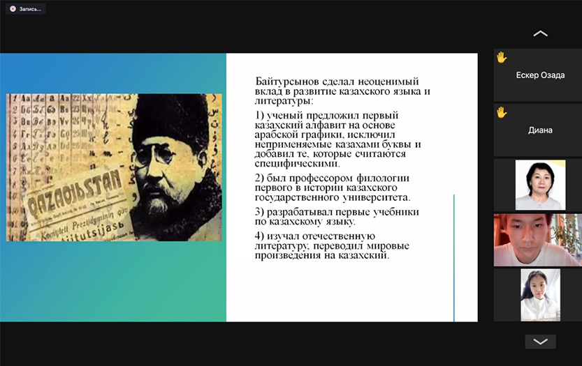 103-топтың эдвайзері Бибіжан Абуованың жетекшілігімен студенттер қызықты іс-шара дайындады. А. Байтұрсынұлының өмірі мен қызметі туралы әңгіме көрнекі презентациямен сүйемелденді, ақынның өлеңдері әртүрлі тілдерде оқылды. Кездесуге викторина және танымдық кроссворд сұрақтары интерактивті сипат берді.