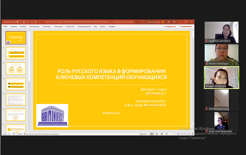 2021 жылдың 22 қазанында Филология және көптілді білім беру институтының орыс тілі мен әдебиеті кафедрасының негізінде Л. В. Сафронованың ұйымдастыруымен докторанттардың ғылыми семинары өтті. Семинарда «Орыс тілі мен әдебиеті» мамандығының екінші курс докторанттары Дюсенова Динара «Негізгі құзыреттерді қалыптастырудағы орыс тілінің рөлі» (ғылыми жетекшісі ф.ғ.д., профессор М.Ш. Мусатаева) және Молдағали Мадина «Lithuanian State Scholarship: алмасу бағдарламасы. Жас Ғалымдардың Мектебі Квантитативтік филология» атты баяндамаларын жасады (ғылыми жетекшісі профессор С. Абишева).
