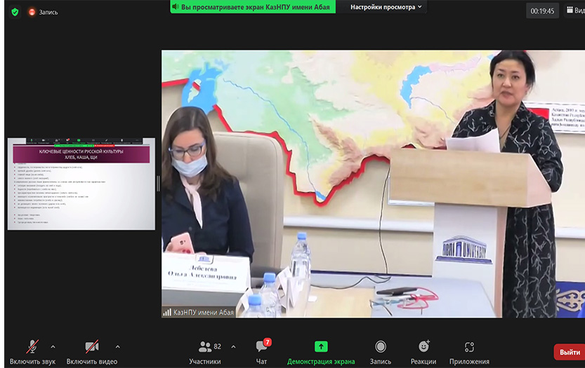 Пленарлық отырыста орыс тілі және әдебиеті кафедрасының меңгерушісі, филология ғылымдарының докторы, профессор Сәуле Әбішева «Қазіргі әлеуметтік-мәдени кеңістікті қалыптастырудағы орыс тілі» тақырыбында баяндама жасады. Конференцияның секциялық отырыстарында кафедра оқытушылары: Гүлнұр Байшукурова, Гүлмира Қажығалиева, Мехирнис Хавайдарова, Марина Асылбекова, Бақытгүл Жұмағұлова, Ақерке Іргебаева, Феруза Ержанова және Мәдина Абаева сөз сөйледі.