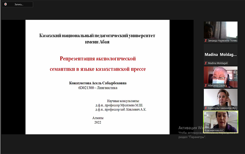 2022 жылдың 31 қаңтарында Филология және көптілді білім беру институтының орыс тілі мен әдебиеті кафедрасында «6D021300 - Лингвистика» мамандығы бойынша философия докторы (РhD) дәрежесін алу үшін Әсел Қожахметованың «Репрезентация аксиологической семантики в языке казахстанской прессы» («Қазақстан баспасөзі тіліндегі аксиологиялық семантиканың репрезентациясы") тақырыбындағы диссертациялық жұмысын талқылауға арналған кеңейтілген отырыс өтті. Ғылыми кеңесшілері - филология ғылымдарының докторы, профессор Манаткүл Мұсатаева және филология ғылымдарының докторы, профессор Александр Киклевич (Ольштынадағы Варминск-Мазур университеті, Польша).