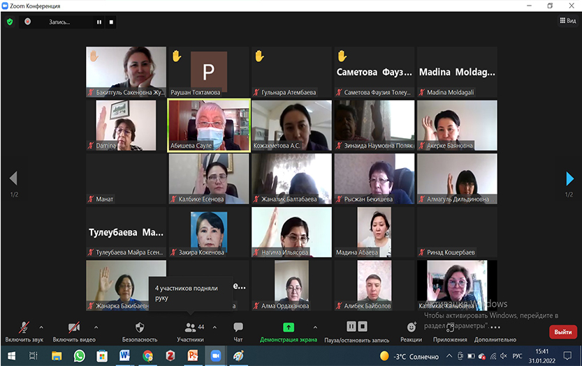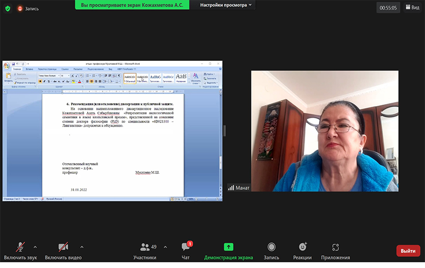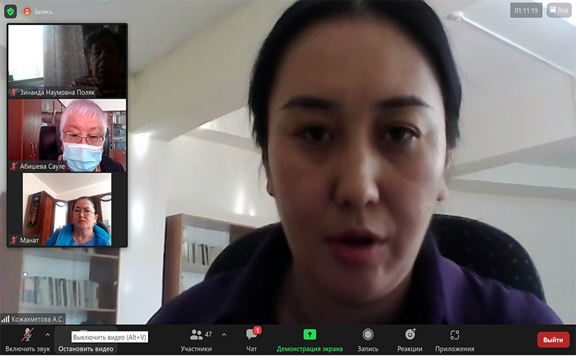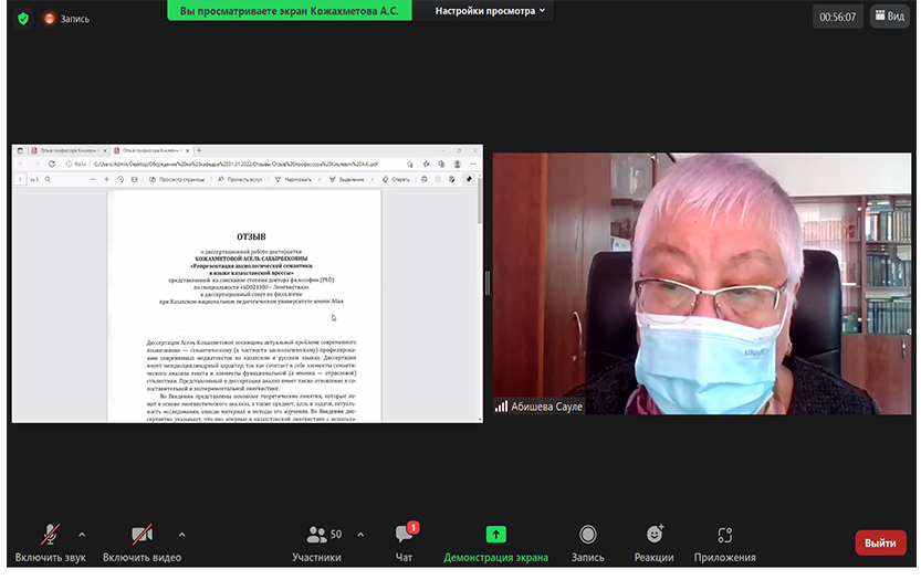 Отырыс ZOOM платформасы арқылы онлайн форматта өтті. Отырыс төрайымы профессор Сәуле Әбішева қатысушыларды күн тәртібімен таныстырып, ізденушіге сөз берді.