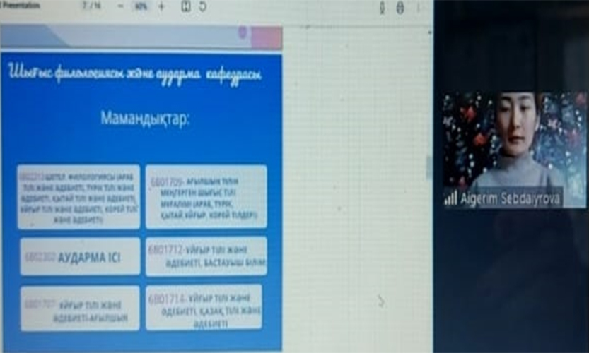 2022 жылдың 18 ақпанында «Мамандық - болашаққа бастар жол» кәсіптік бағдар беру жобасы аясында Филология және көптілді білім беру институтының шығыс филологиясы және аударма кафедрасының аға оқытушылары Ж.М.Елемесова мен Е. Ж.Қансейітова ZOOM платформасында онлайн-конференция өткізді. Түркістан облысы, Арыс қаласындағы Қабылсай мектебінің директоры Ш.С.Жүзжанов, Алматы облысы, Қарасай ауданы, Үштерек орта мектебінің директоры, Р.А. Жұрын қатысты. Аталған мектептердің 11-сынып оқушыларына Абай атындағы ҚазҰПУ, Шығыс филологиясы және аударма кафедрасының мамандықтары туралы толық мағлұмат берілді.