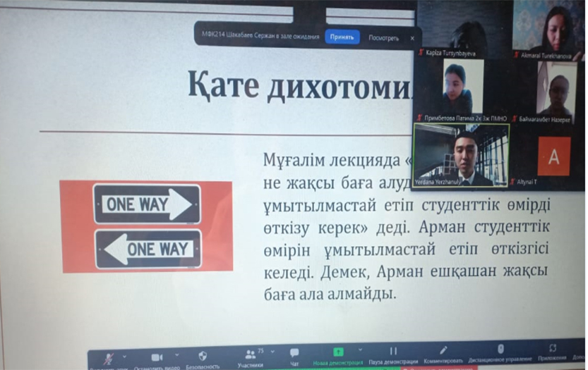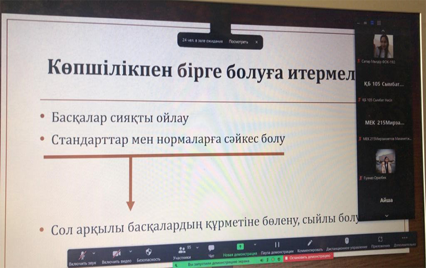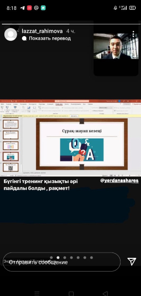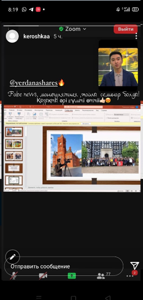 Жаһандану дәуірінде жекелеген деструктивті элементтердің арандатушылық, теріс пікір білдіру, үндеу айтуы қауіпті. Мұндай ақпаратты күнде кездестіреміз. Ердана Ержанұлы сенімді хабарлар мен фейк жаңалықтардың айырмашылығын түсіндіріп, соңғысының манипуляциясынан сақ болуды ұсынды. Тренинг барысында қатысушылардың медиа сауаттылық құзіретін анықтау үшін интерактивті Mentimeter.com - нақты уақытта жүргізілетін онлайн сауалнама жүргізілді. Студенттер жүргізушіге өздерін қызықтырған мағлұматтар бойынша сұрақтар қойды.