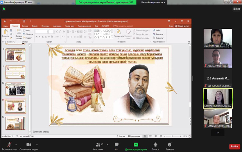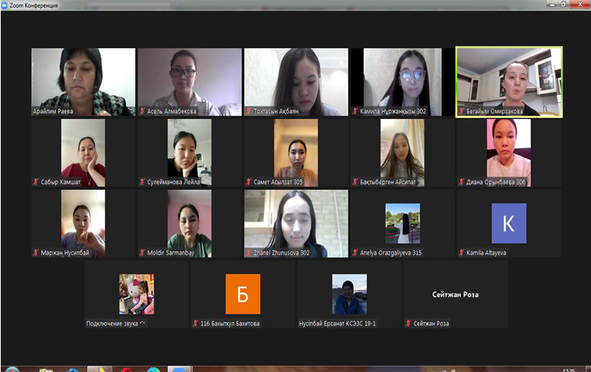 Тәрбие сағатына магистр, аға оқытушы Алмабекова Асель Муратхановна, магистр, аға оқытушы Раева Арайлым, аға оқытушы, ф.ғ.к. Қайсейтова Э.Ж, және кафедра студенттері мен шетел тілі:екі шет тілі, 3 курс студенттері, 2 курс «Ағылшын тілін меңгерген шығыс тілі мұғалімі» мамандығы, қытай тілі бөлімінің студенттері қатысты.