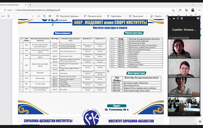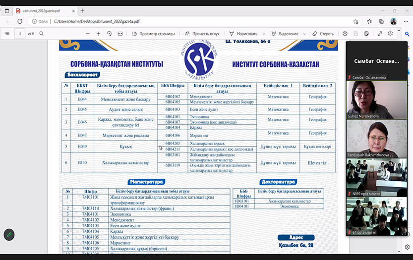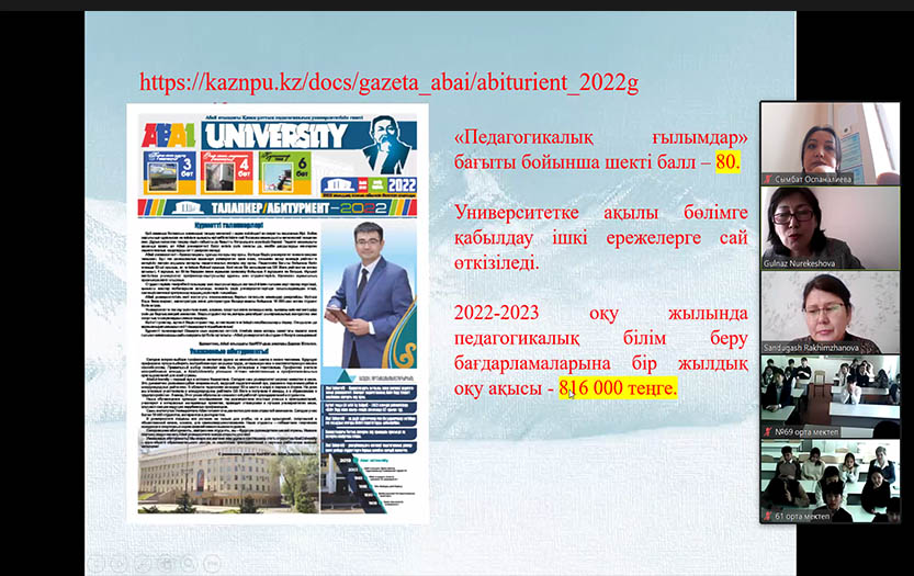 Кездесу барысында оқытушылар мен 2 курс магистранты С.Оспаналиева университет туралы толық мағлұмат беріп, түлектерге бейнеролик көрсетті. Сондай-ақ, педагогикалық мамандық таңдаудың өзіндік орны мен өміршеңдігін заманға сай дәлелденгендігін, шәкіртақының өскендігін және көпшіліктің назары қазіргі таңда осы педагогикалық мамандықтарда екенін баяндап, таңдауларын дұрыс жасауға шақырды.