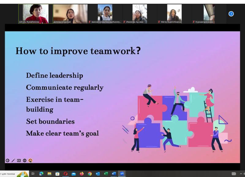 «Командалардың әртүрлі типтері және олардың компаниядағы қызметтері» дәрісі аясында студенттер команда мен топтың негізгі айырмашылықтары мен ерекшеліктерімен таныстырылды; командалардың жіктелуі және оларды келесі төрт сипаттама бойынша санаттарға бөлу ұсынылды: мақсаты, жарамдылық мерзімі, мүшелігі және құрылымы, сондай-ақ компания қызметкерлерінің қызметін ұйымдастыру және үйлестіру тәсілдері сипатталған. «Табысты команда құру қадамдары» дәрісі табысты команданы қалыптастырудың негізгі кезеңдерін қамтыды. «Көшбасшылық стильдері және олардың компанияға әсері» дәрісі барысында басқару стильдері арасындағы негізгі айырмашылықтар, олардың артықшылықтары мен кемшіліктері қарастырылды. Компанияның сәтті жұмыс істеуі үшін басқару модельдерін дұрыс таңдаудың маңыздылығы атап өтілді.