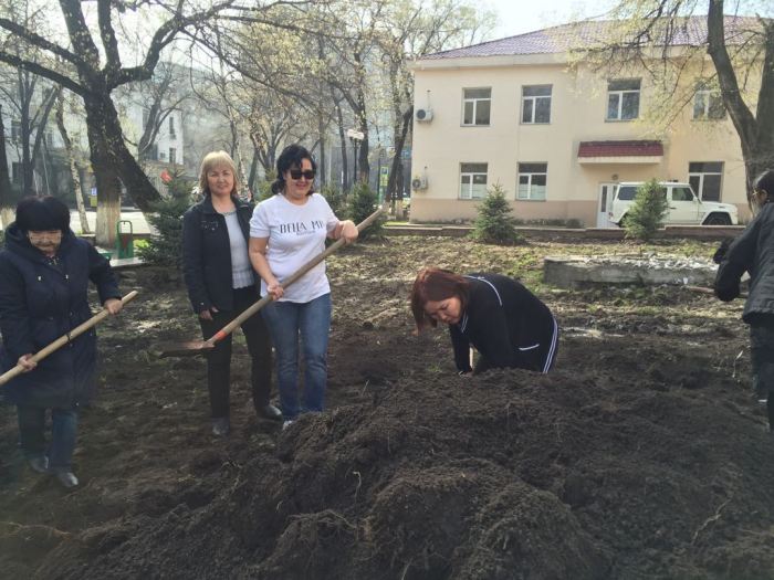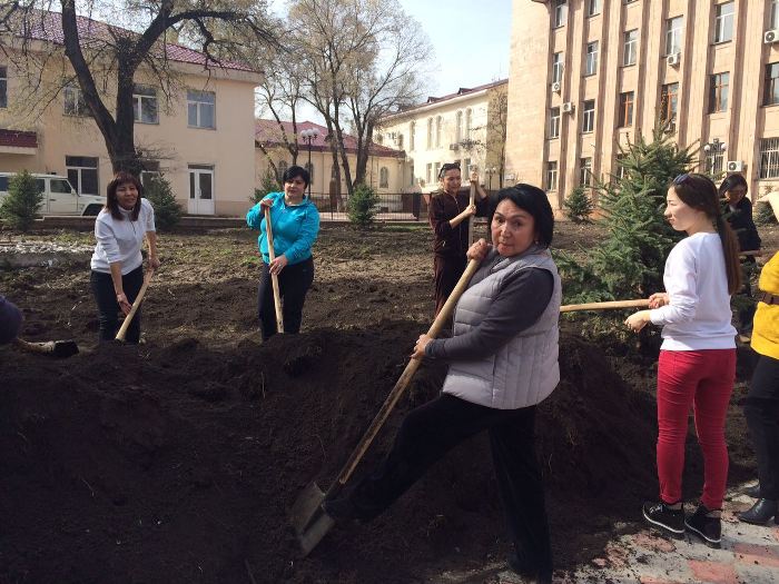 2018 жылдың 31 наурызында Университеттің қызметкерлері мен оқытушылары университеттің аумағында және университет айналасындағы орындарда тазалау жұмыстарын жүргізді. Практикалық тілдер кафедрасы сенбілік жұмысына белсене қатысты. Университет ректоры Такир Балықбаев алғы сөзінде жұмысқа сәттілік тілеп, алғашқы болып қылқан жапырақты ағаш отырғызды. Сенбілік институт директорларының бір-бір ағаштан отырғызуларымен жалғасты. Филология және көптілді білім беру институтының ұжымы өздеріне белгіленген университеттің бас ғимаратының жанындағы аумақта ынтагерлікпен жұмыс істеді. Университеттің барлық оқытушылары үшін үлкен дастархан жайылып, дәмді палау ұсынылды.