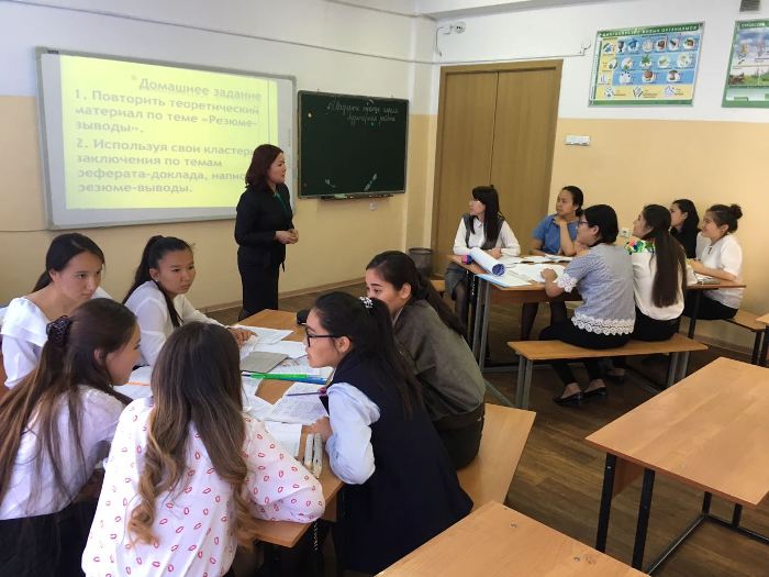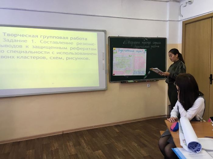 Сабақтың мақсаттарын іске асыру үшін келесідей жұмыс түрлері пайдаланылды: сөздік жұмыстары, тренингтер, топтар бойынша шығармашылық жұмыс, мәтіннің мазмұны бойынша кластер құрастыру, реферат тақырыбы, тұжырымдардың түйіні, синквейн құрастыру, бақылау сұрақтарына жауап беру, рефлексия, сабақты қорытындылау, үй тапсырмасы.