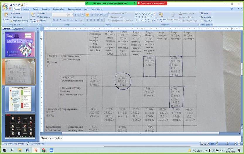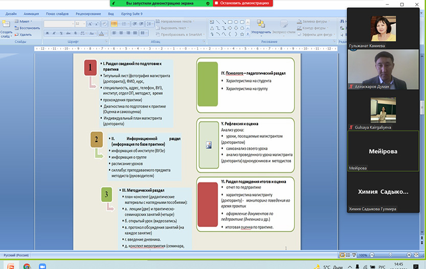 2021 жылдың 18 қазанында Абай атындағы ҚазҰПУ Жаратылыстану және география институтының «7М01510-Химия», «7М01513-Биология», «7М01515-География», «7M05101-Биология» мамандықтарының 2 курс магистранттары үшін педагогикалық практикаға арналған онлайн таныстыру конференциясы өткізілді. Іс-шара Zoom платформасында өтті.