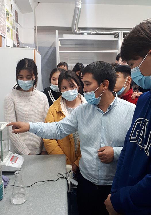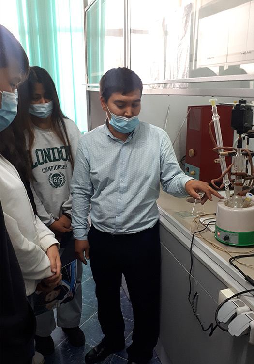 «Химия» БББ тобының оқытушыcы, PhD докторант Қанат Садықов оқушыларға ғылыми-зерттеу зертханасының қызметі туралы түсіндіріп, химиялық құрылғылардың жұмыс істеу принциптерімен (газ сұйықтықты хроматограф, спектрофотометр, pH-метр, аналитикалық таразы, термостат, кептіру шкафтары, муфель пештері т.б.) таныстырды.
