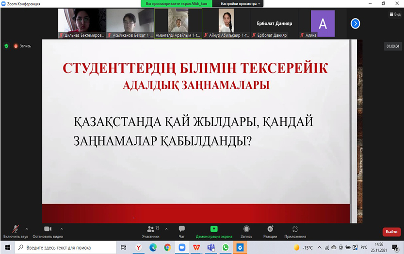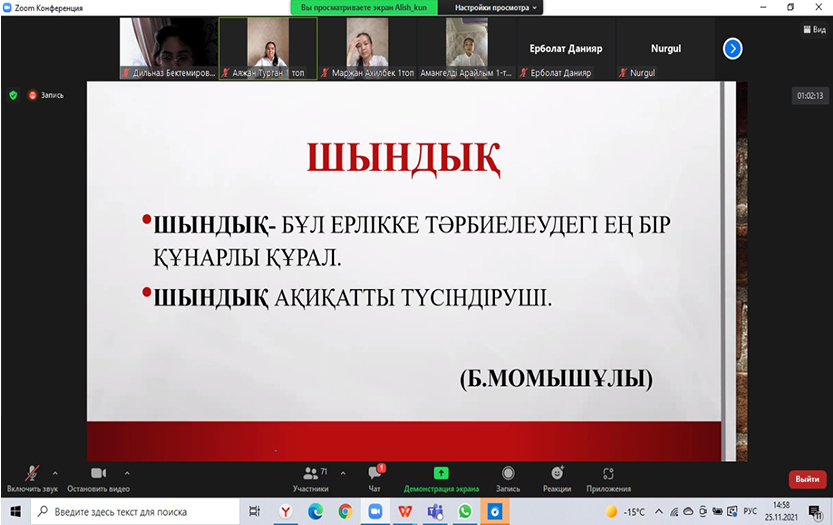 2021 жылдың 25 қарашаcында Жаратылыстану және география институтының 2021/2022 оқу жылының кешенді жоспарына сәйкес, «6B01513-Биология» мамандығының 1 курс 1 топ студенттері мен топ тәлімгері: Асия Майматаеваның ұйымдастыруымен ZOOM платформасында «Шындық жоқ жерде сұмдық көп» атты ашық тәрбие сағаты өтті. Тәрбие сағатына «Биология» білім беру бөлімінің профессор-оқытушылар құрамы мен 1-4 курс студенттері белсене қатысты.