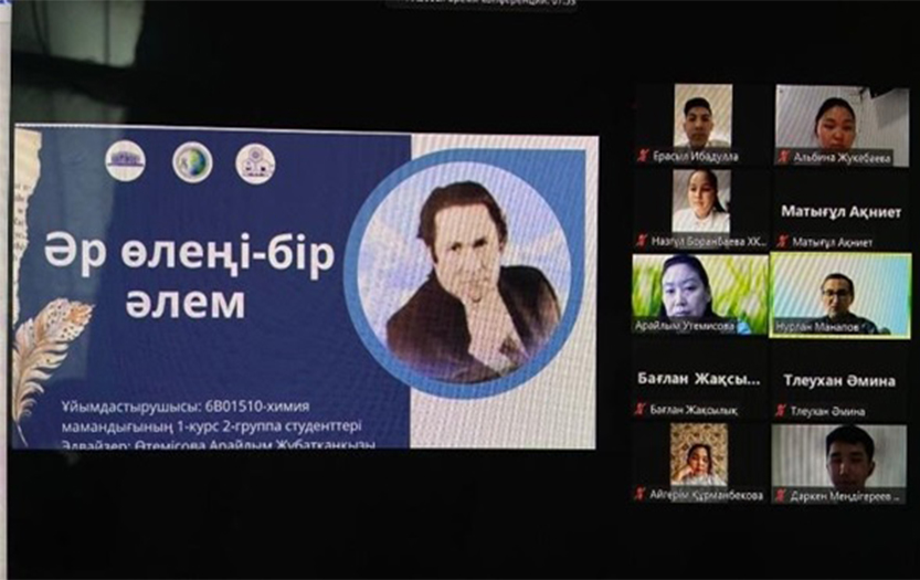 2022 жылдың 9 ақпанында Абай атындағы ҚазҰПУ Жаратылыстану және география институты «6В01510-Химия» мамандығының 1курс 2 топ студенттері мен топтың тәрбие жетекшісі, аға оқытушы Арайлым Өтемісованың ұйымдастыруымен, зум платформасында «Әр өлеңі-бір әлем» тақырыбында поэзия кеші өтті.