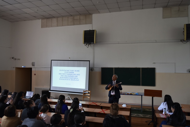 Жаратылыстану және география институтының директоры Күләш Каймулдинова бітіруші түлектердің алдында сөз сөйледі. Абай университетінің табалдырығын студент болып аттап, институт директорының дәрежесіне дейін көтерілген, мектептегі «География» пәні оқулықтарының авторы Күләш Дүйсенбаеваның кәсіби өмір жолы оқушылар үшін үлкен үлгі-өнеге, мол тағылым болды.
