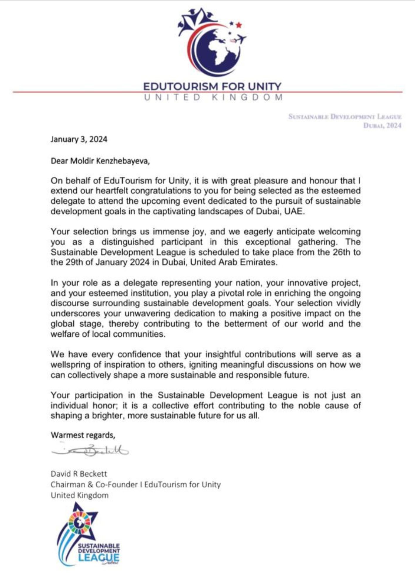 Жаратылыстану және география институтының магистранты Мөлдір Кенжебаева ЮНЕСКО-ның педагогика және мұғалімдерді оқыту кафедрасының ұсынысы бойынша Edu tourism for Unity ұйымдастырған Тұрақты даму лигасының (Sustainable Development League) жаһандық кездесуіне еліміздің атынан қатысты.
