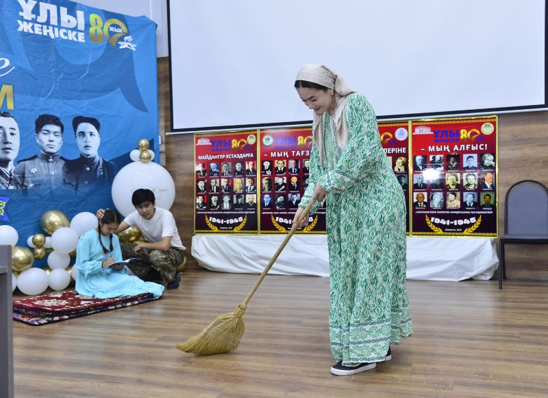 Жеңістің 80 жылдығына арналған мерекелік жиын, факультеттің 2-ші курс студенттерінің арнайы дайындаған мәдени бағдарламасымен жалғасын тапты. Олар «Ешкім де, ешқашан да ұмытылмақ емес!» бейнеролигін дайындап, осы орайда факультетте ұстаздық қызмет атқарған және оның түлектері арасынан шыққан майдангерлер мен тыл еңбеккерлері жайлы олардың аты-жөндері жазылып және суреттерімен безендірілген төрт фотостендтен тұратын ақпараттық бұрыш әзірледі. Және де университетіміздің архивінен алынған тың деректерді пайдаланып даярланған фотоальбомда, олар жайлы мәліметтер берілген. Сонымен қатар іс-шара кезінде батыр тұлғаларымыз, «География» мамандығының түлектері: «Кеңестер Одағының батыры» - Қанаш Қамзин мен «Халық Қаһарманы» - Мөрдін Таипов, тыл ардагері - академик Ә.С.Бейсенова және соғыс жылдары Алматыға эвакуацияланған, оқу орнымыздың «Экономикалық география және географияны оқыту әдістемесі» кафедрасының меңгерушісі болған - академик Н.Н.Баранский туралы қысқаша баяндама жасалды. Әсіресе көрермен қауымға ерекше әсер сыйлаған, ол өнерлі білімгерлеріміздің музыкалық қойылымдары болды. Атап айтсақ: «География-тарих» мамандығы студенттерінің «Мәңгілік ұмытылмас ерлік» атты сахналық көрінісі мен осы топтың қыздарының орындауындағы «Катюша» биі және т.б.