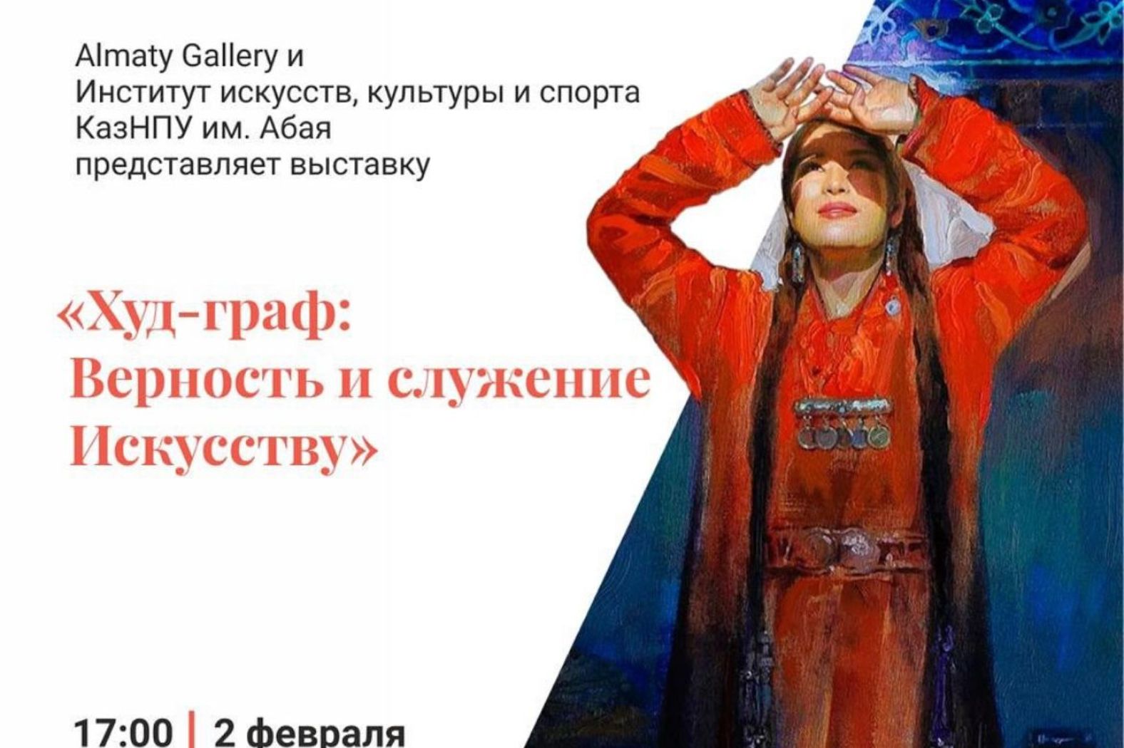 «Худ-граф: Адалдық және өнерге қызмет ету» көрмесі 2024 жылдың 2 ақпанында Алматы қаласы Мәдениет басқармасына қарасты Almaty Gallery «Алматы әуендері» КМҚК Абай атындағы ҚазҰПУ Өнер, мәдениет және спорт институты құрылғанына 55 жыл толуына орай «Худ-граф: Адалдық және өнерге қызмет ету» көрмесінің ашылуы өтті. Алматының көркемсурет галереясының көрме залында жетпістен астам акварельмен, майлы бояумен салынған суреттер, графикалық жұмыстар, сондай-ақ қазіргі заманауи Қазақстанның белгілі суретшілері мен мүсіншілерінің шағын нысандарындағы мүсіндері қойылған. Көрмедегі пейзаж, портрет, тарихи және тұрмыстық жанрларда жазылған туындылардың тақырыбы мен орындау техникасы бойынша саналуандылығы көзге түседі. Академиялық көркемдік білімі бар, өз жұмысында жаңа формаларды іздейтін суретшілер, мүсіншілер өз тамырларына деген терең сүйіспеншілікпен, өз шығармалары арқылы жеткізетін өз халқының тарихына деген құрмет пен қызығушылықпен біріктіріледі. «Худ-граф: Адалдық және өнерге қызмет ету» көрмесі отандық көркемдік білімнің заманауи альма-матерінің шығармашылық әлеуетін, тынымсыз ізденіс пен көркем эксперименттердің белестері мен нәтижелерін, қазақстандық суретшілер мен Қазақстан ұстаздарының тәжірибесі мен жетістіктерін көрсетуге арналған.