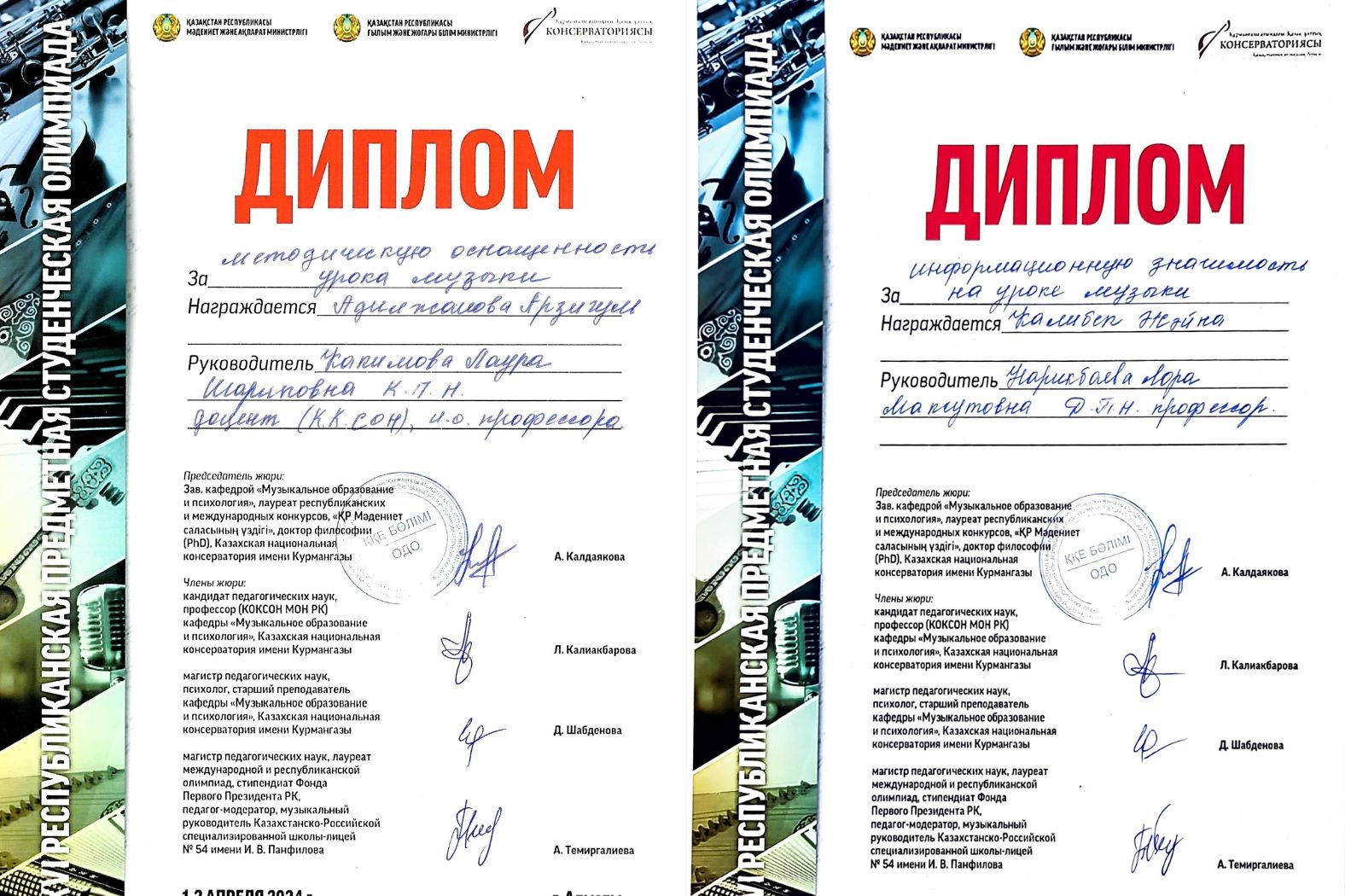 «6в014-Музыкалық білім» ББ бойынша XVI Республикалық пәндік студенттік олимпиада 2024 жылдың 1-2 сәуірінде «РММ Құрманғазы атындағы Қазақ ұлттық консерваториясы» «Музыкалық білім және психология» кафедрасының базасында «Музыкалық білім» білім беру бағдарламасы бойынша XVI-ші Республикалық пәндік студенттік олимпиадасының 2-ші кезеңі өтті. Олимпиада «Музыканы оқыту әдістемесі» пәні бойынша екі номинациядан қамтыды: 1) «Музыканы оқыту әдістемесі», 2) «Музыкалық ағарту».