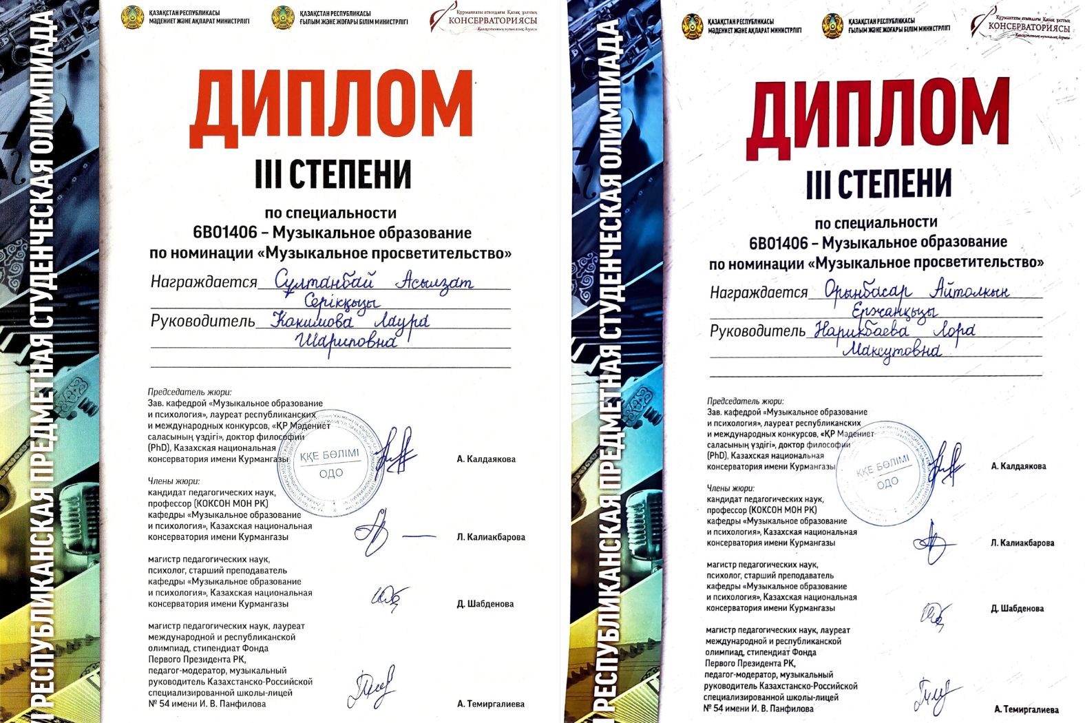 «Музыкалық ағарту» 2 - номинациясы бойынша: Орынбасар Айтолқын Ержанқызы, 2 (4) курс, 6В01402 - Музыкалық білім» (Жетекшісі: п.ғ.д., профессор Л.М. Нарикбаева); Сұлтанбай Асылзат Серікқызы, «6В01402 - Музыкалық білім» (Жетекшісі: п.ғ.к., профессордың м.а. Л.Ш. Какимова).