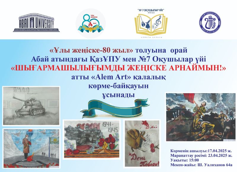 «Шығармашылығымды Жеңіске арнаймын» қалалық көрме-байқауы 2025 жылдың 17 мен 23 сәуірі аралығында Абай атындағы ҚазҰПУ Өнер факультеті және Алматы қаласы Білім басқармасы «№7 Оқушылар үйі» МКҚК ұйымдастыруымен Ұлы Жеңістің 80 жылдығына орай «Шығармашылығымды Жеңіске арнаймын» атты қалалық көрме – байқауы өтті.
