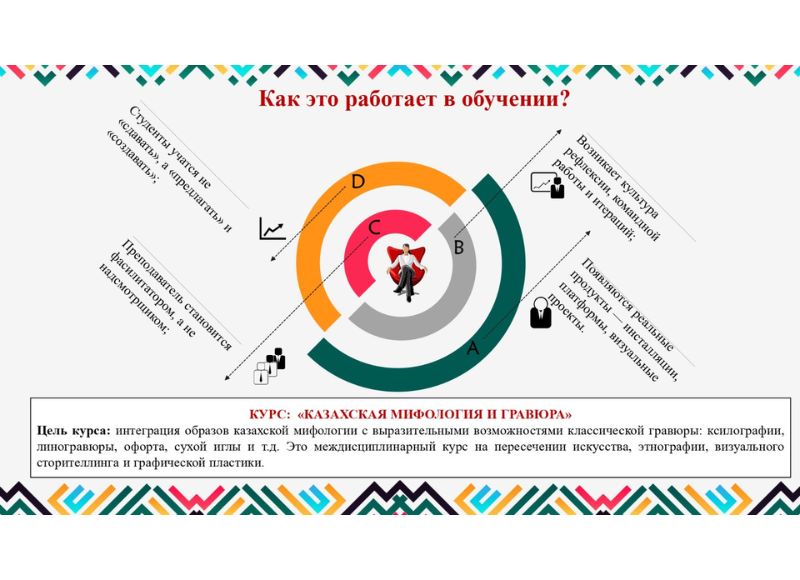 Бұл әдістемелер қазақтың көркемдік-мифологиялық мұрасын — атап айтқанда, қазақ мифологиясы мен гравюра өнерін (ксилография, линогравюра, офорт және басқа да техника түрлері) — заманауи Design Thinking практикасымен ұштастыруды көздейді.