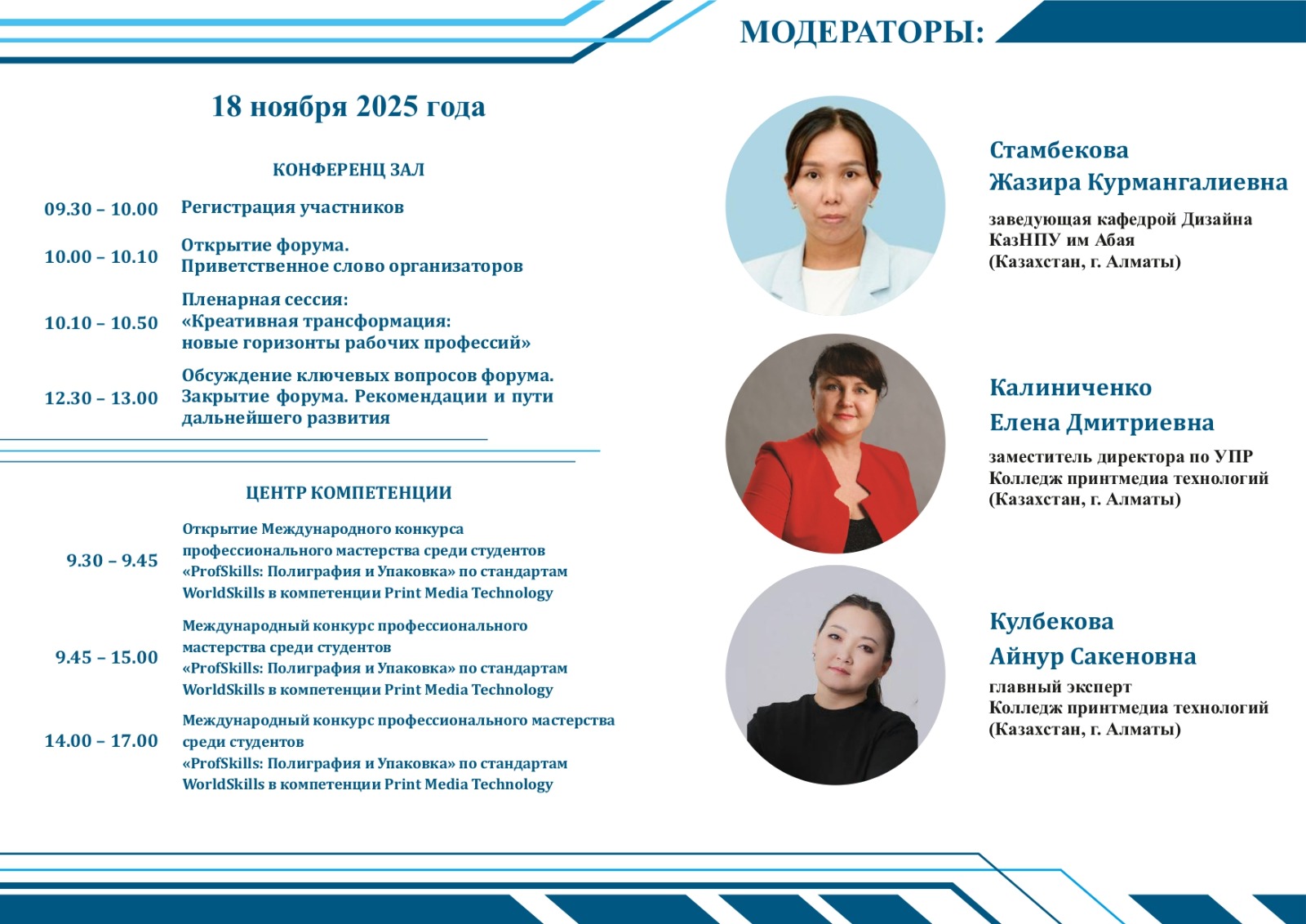 2025 жылдың 17-19 қараша күндері Абай атындағы Қазақ ұлттық педагогикалық университеті ҚР Ғылым және жоғары білім министрлігі мен Алматы қаласы Білім басқармасының қолдауымен «Креативті индустриялардағы жұмысшы мамандықтар: трансформация дәуіріндегі дизайн және полиграфия» атты Халықаралық форум өткізді.