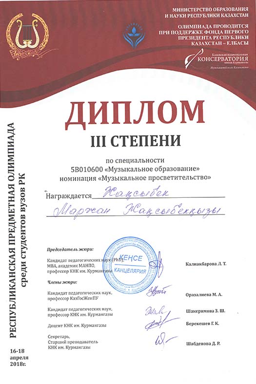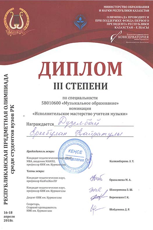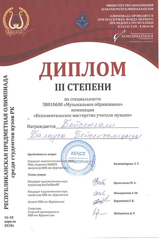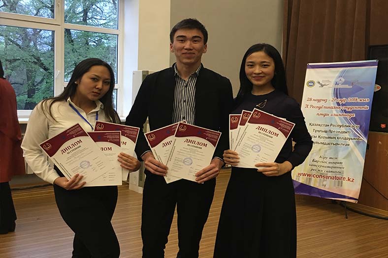 2018 жылының 16-18 сәуірі аралығында Алматы қаласында Құрманғазы атындағы Қазақ ұлттық консерваториясында 5В010600-Музыкалық білім мамандығы бойынша Республикалық студенттік пәндік олимпиадасына төмендегі студенттер құрамы жіберілді: Маржан Жақсыбек - 3 курс, Нұржігіт Аманбеков - 3 курс, Еркебұлан Дүзелбай - 4 курс, Балауса Бейсенғали - 4 курс. Жетекшілері: Өнер, мәдениет және спорт институты, Музыкалық білім және хореография кафедрасының профессоры, п.ғ.д. Бекен Бекмухамедов, п.ғ.д. Менсұлу Джексембекова, п.ғ.к. Светлана Балагазова, өнертану канд. Ажар Айтуарова, доцент Сәбен Бәрібаев.