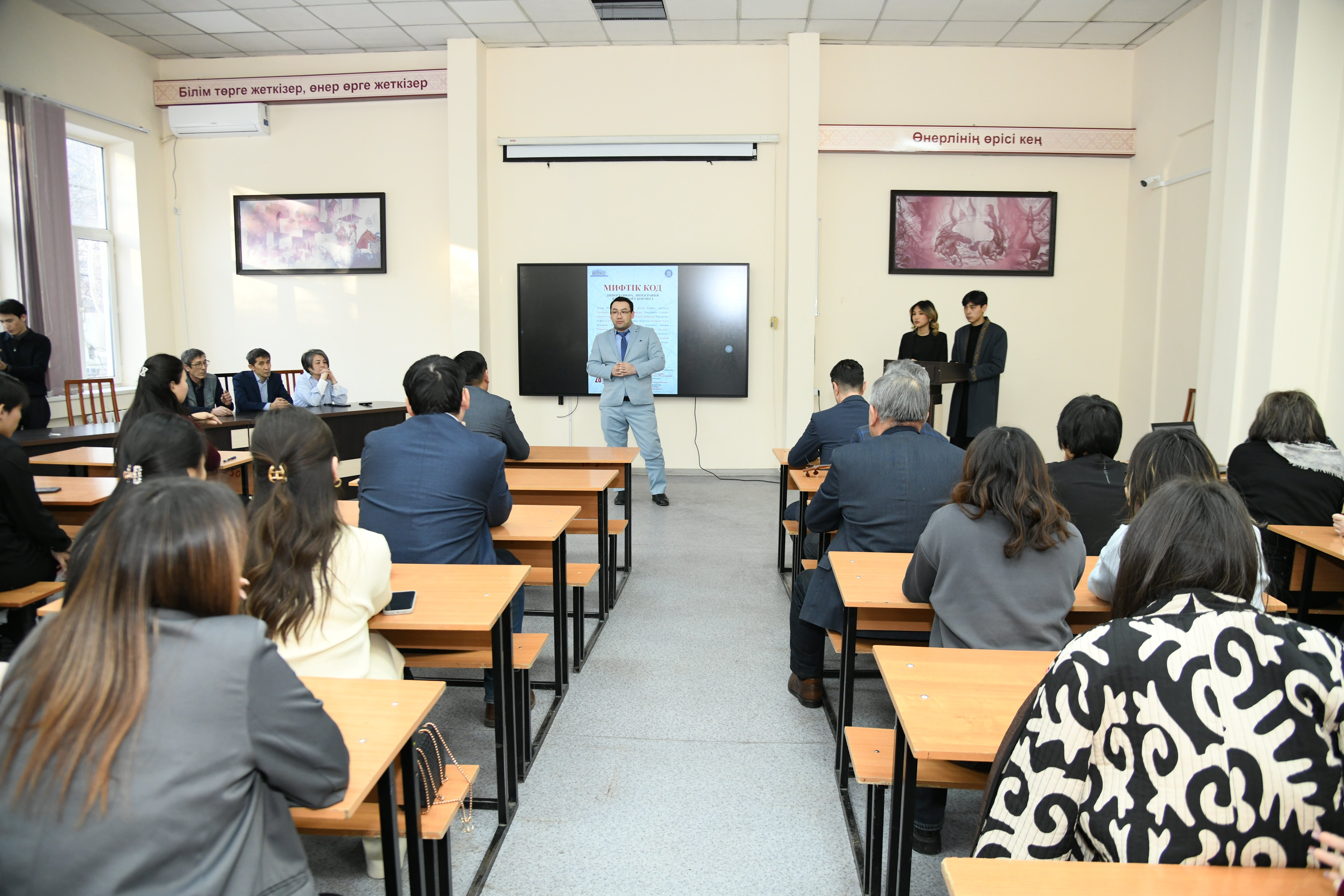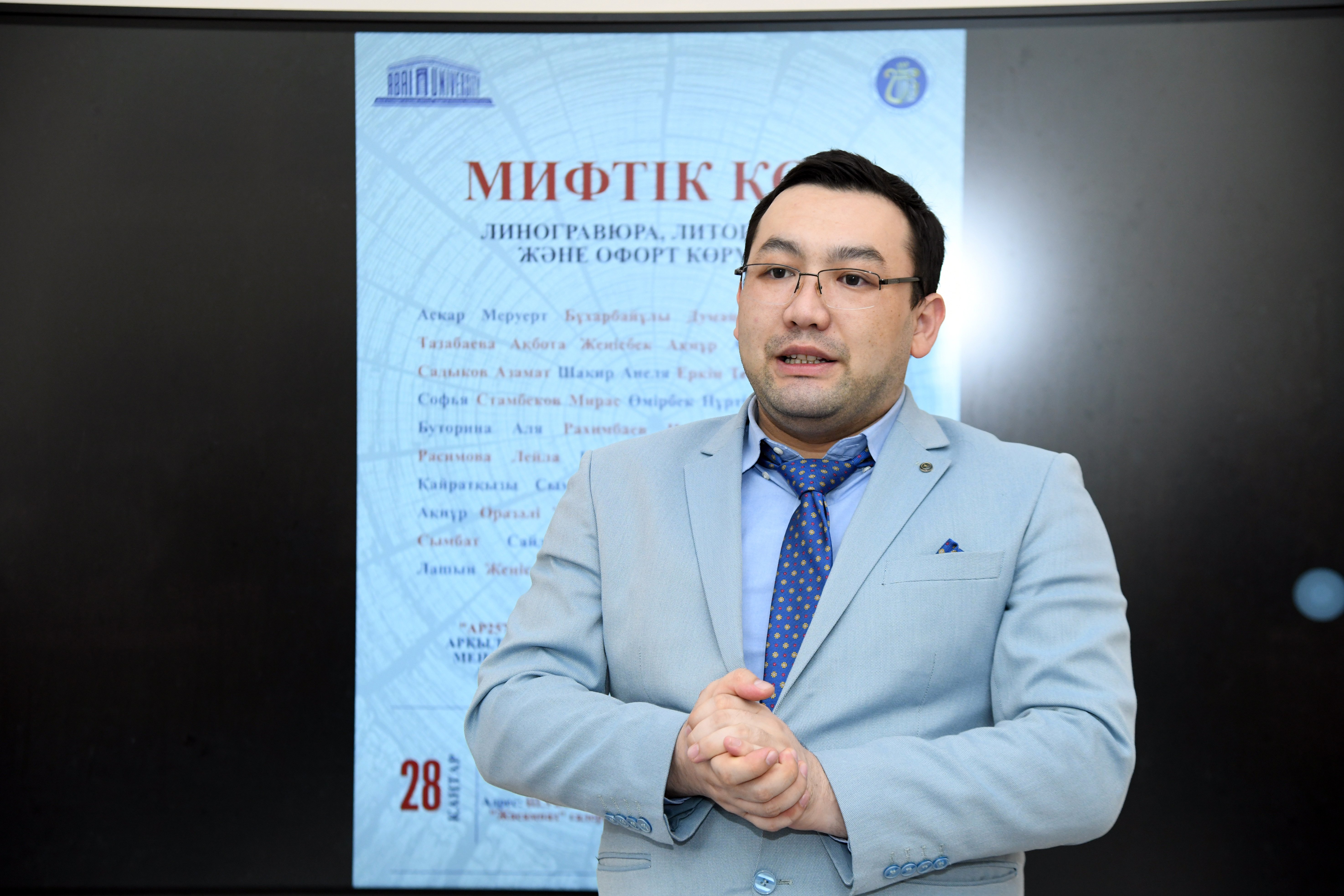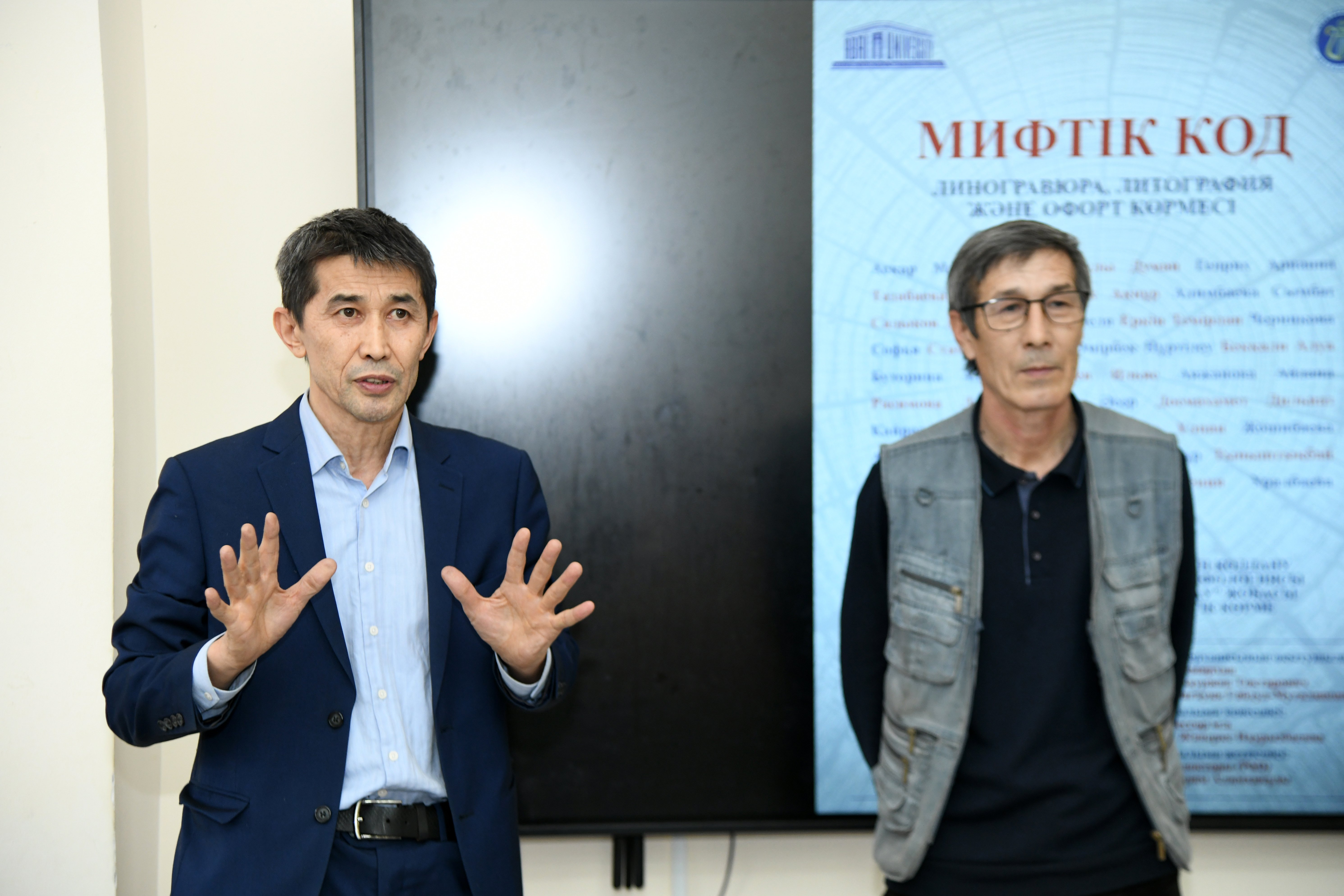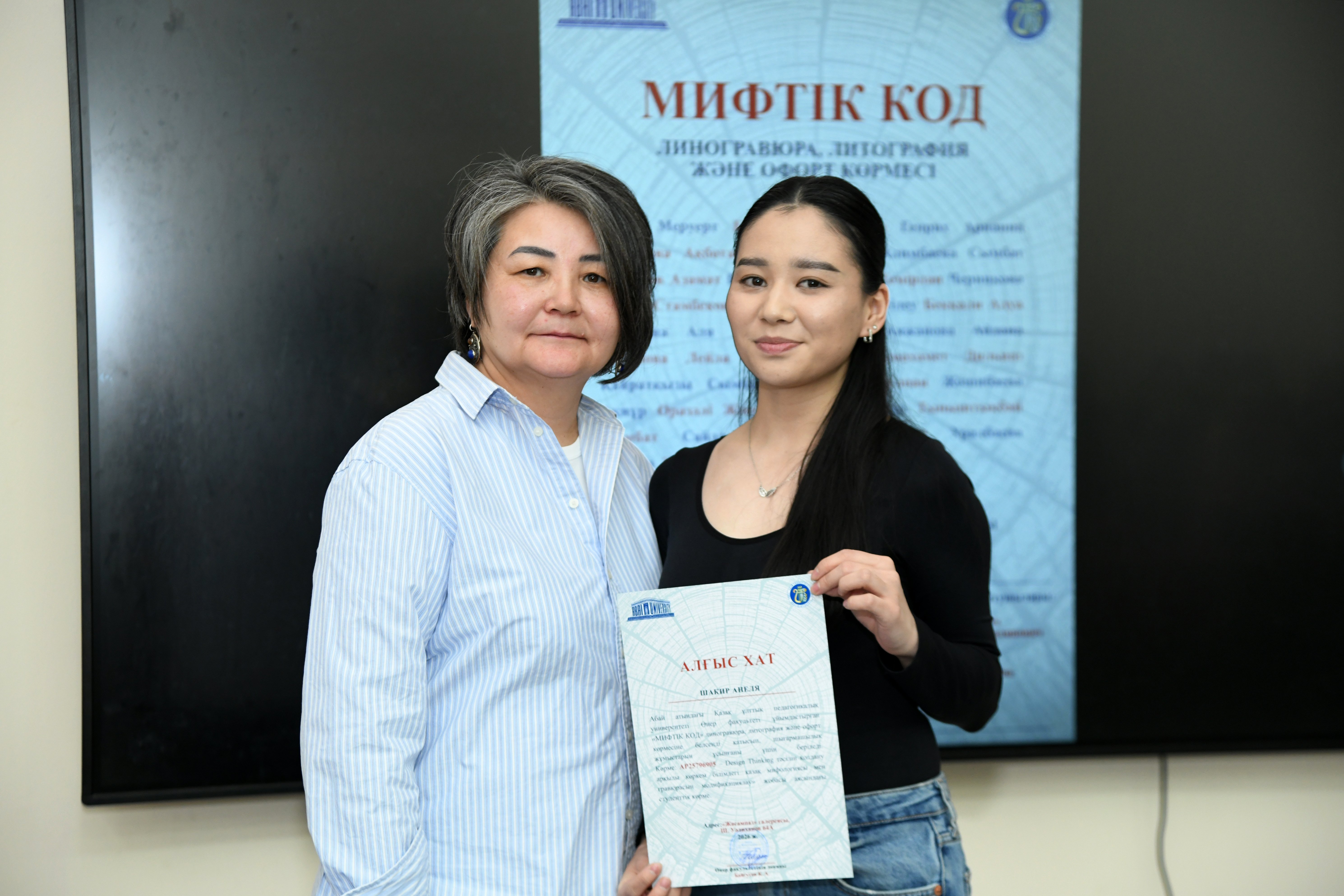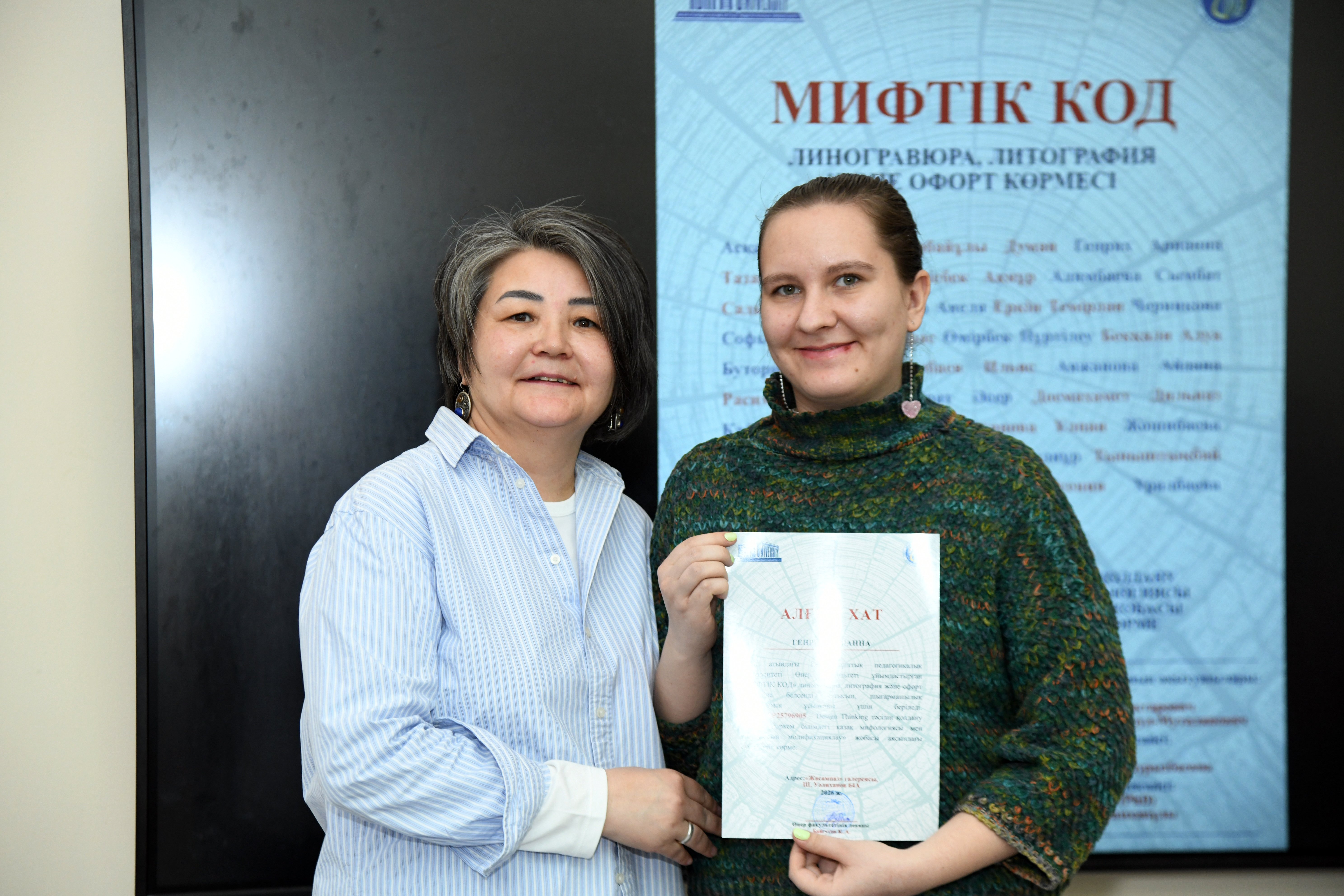 28 қаңтар күні сағат 15:00-де Абай атындағы Қазақ ұлттық педагогикалық университетінің Өнер факультеті «Жасампаз» галереясында (Ш. Уәлиханов 64А) «МИФИЧЕСКИЙ КОД» атты линогравюра, литография және офорт көрмесін өткізді.
