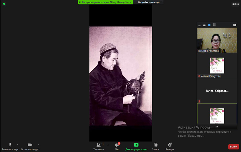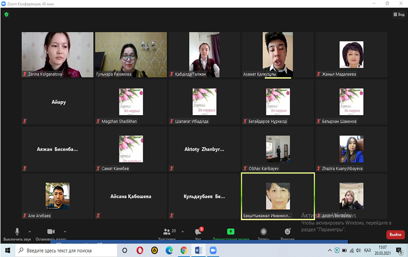 2021 жылдың 20 наурызында Тарих және құқық институты философия және әлеуметтік-философиялық пәндер кафедрасының аға оқытушысы 1 курс, 102-топтың эдвайзері Гүлнара Рахимованың ұйымдастыруымен «Берекелі әз-Наурыз» тәлімдік-тәрбиелік сағаты өтті.