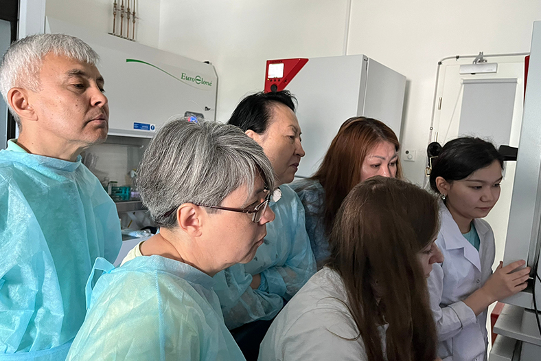 Абай университеті мен Назарбаев университеті арасындағы ынтымақтастық туралы Меморандум аясында Жаратылыстану және география институтындағы «Биология» кафедрасының 4 оқытушысы: профессор З.Б.Тұңғышбаева, аға оқытушылар Д.Қ. Құлжанова, Т.Н. Нуркенов, Г.К.Ташенова Назарбаев университетіндегі Биоинженерия және регенеративті медицина зертханасында бір апта (29.05-03.06.2023 ж.) білімді жетілдіру курсынан өтті. Алғашқы күні (29.05.23 ж.) НУ зертханаларын аралатып, ондағы қолданылатын заманауи ғылыми зерттеу жұмысына арналған құрал-жабдықтар туралы мәліметтермен, жұмыс істеу ережелерімен және биоинженерия зертханасының ғылыми жобаларымен таныстырды. Екінші күні «Заманауи микроскопиялық әдістерді қолдану бойынша эукариоттық жасушаларын культивациялау негіздері» тақырыбында дәріс (30.05.23 ж.) оқылды. Практикалық сабақтарда сол әдістерді қолданып, келесі зертханалық жұмыстарды жүргізді: Зертханалық жануарлардың сүйек кемігі және май ұлпаларынан мезенхималық бағаналы жасушаларды бөліп алу әдісін қолдана отырып, тышқанға тәжірибе жасады (31.05.23 ж.). Тәжірибе болғаннан кейін осы тақырыпқа байланысты дәріс оқылды. Иммунофлюоресцентті микроскопиялық әдіспен танысты (01.06.23 ж.). Ядро мен актині боялған жасушаны микроскоп арқылы бақылады. Гистохимиялық зерттеу әдістерін қолданып, препараттарды бояу жұмысын жасады (02.06.23 ж.). Массон-Трихром бояуы Sigma-Aldrich-HT15_1KT наборы қолданылады. А ерітіндісін дайындап, бөлімдерді парафинсіздендіру әдісі меңгерілді. Вейгерт темір гематоксилинімен (гем А + гем В) бірдей көлемде алу немесе Эрлихпен 5 - минут бойы бояу әдісі жасалды. Сусыздандыру, гематоксилин - эозин бояу, муцикарминмен бояу әдістері меңгерілді.