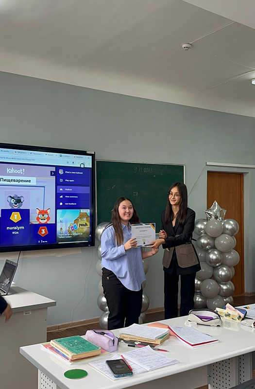 «Ойлан тап» сұрақ-жауап ойыны және нейро-психологиялық ойын ойнатылды. Сонымен қатар бір- біріне алманы алмастыру арқылы білген мәліметтерін айтып сабақты қорытындылады. Ашық сабақта өткізілген әдіс - тәсілдер студенттің белсенділігін, пәнге құштарлығын, сыни ойлау қабілетін және ізденімпаздығын арттырады, жасырынып жатқан қабілеттерін ашуға көмектеседі, өзіне деген сенімділік пайда болады. Студент негізгі ұғымдарды еске сақтайды, білім сапасы жақсара түседі, өз сыныптастарымен диалогқа қатысады, бір-біріне қолдау көрсетеді, топта жұмыс жасай білуге дағдыланады, басқаға сын көзбен қарап, тиімді шешім қабылдауына мүмкіндік алады.