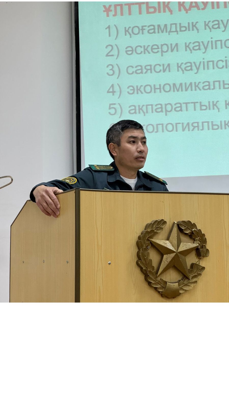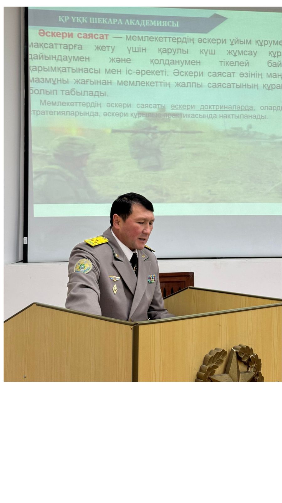 Бастапқы әскери дайындық кафедрасының жылдық жоспарына сәйкес, ҚР Ұлттық қауіпсіздік комитеті Шекара академиясының PhD., қауымдастырылған профессор, полковник Жұмашев Ардақ Базарханұлы және подполковник Бахытбеков Азамат Бахытбекұлы «Қазақстан Республикасының әскери саясаты: негіздері, бағыттары және қауіпсіздік стратегиясы» атты қонақ дәріс оқыды. Бұл дәрісте- Қазақстан Республикасының әскери саясатының мәнін, негізгі бағыттары мен ұлттық қауіпсіздікті қамтамасыз етудегі рөлін таныстырды. Студенттер көкейде жүрген сұрақтарын қойып, тұжырымды жауаптарын алды. Дәріс соңында кафедра меңгерушісі PhD., қауымдастырылған профессор Айдын Бағдатұлы қонақтарға университет атынан алғыс білдіріп, кәде сый табыстады, алдағы уақытта ғылым, білім саласында бірлескен жоспарлар құрылып бекітілді.
